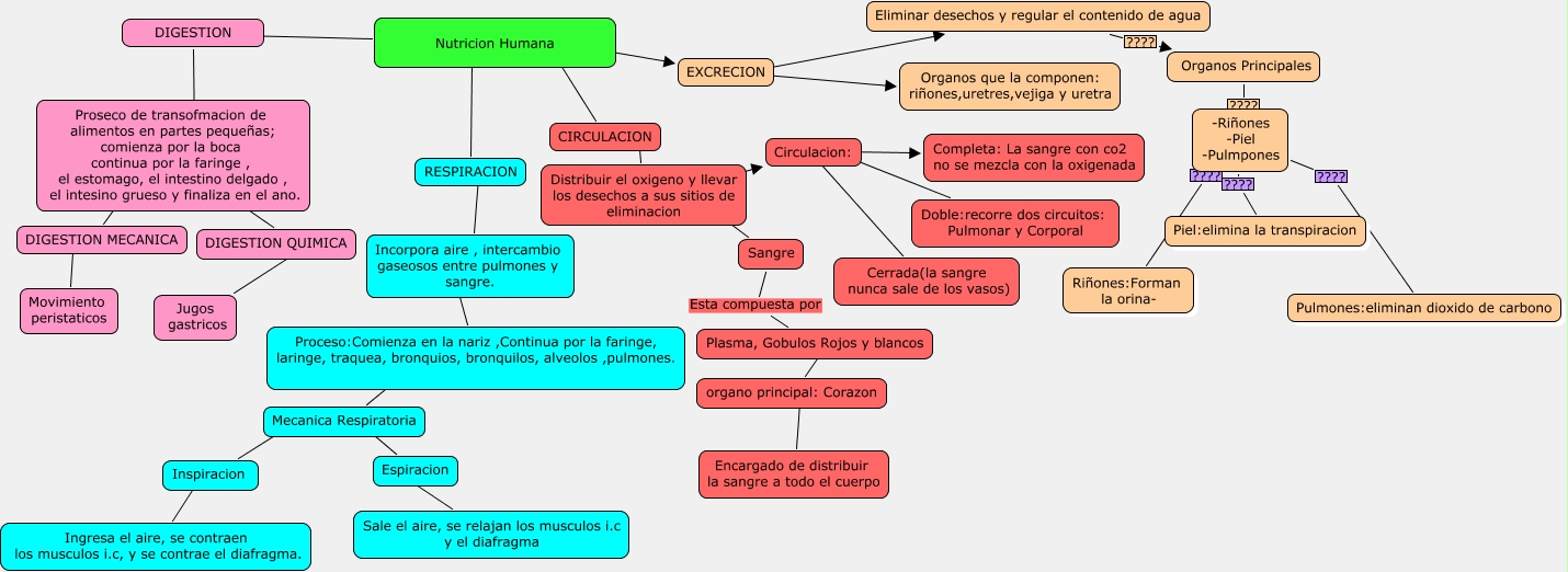 Este Cmap, tiene información relacionada con: nUTRICION cANDE Y mARI.cmap, DIGESTION MECANICA ???? Movimiento peristaticos, Mecanica Respiratoria ???? Espiracion, Nutricion Humana ???? RESPIRACION, EXCRECION ???? Organos que la componen: riñones,uretres,vejiga y uretra, -Riñones -Piel -Pulmpones ???? Pulmones:eliminan dioxido de carbono, Eliminar desechos y regular el contenido de agua ???? Organos Principales, CIRCULACION ???? Distribuir el oxigeno y llevar los desechos a sus sitios de eliminacion, RESPIRACION ???? Incorpora aire , intercambio gaseosos entre pulmones y sangre., Circulacion: ???? Cerrada(la sangre nunca sale de los vasos), Espiracion ???? Sale el aire, se relajan los musculos i.c y el diafragma, Proseco de transofmacion de alimentos en partes pequeñas; comienza por la boca continua por la faringe , el estomago, el intestino delgado , el intesino grueso y finaliza en el ano. ???? DIGESTION QUIMICA, Organos Principales ???? -Riñones -Piel -Pulmpones, EXCRECION ???? Eliminar desechos y regular el contenido de agua, Proceso:Comienza en la nariz ,Continua por la faringe, laringe, traquea, bronquios, bronquilos, alveolos ,pulmones. ???? Mecanica Respiratoria, Incorpora aire , intercambio gaseosos entre pulmones y sangre. ???? Proceso:Comienza en la nariz ,Continua por la faringe, laringe, traquea, bronquios, bronquilos, alveolos ,pulmones., Plasma, Gobulos Rojos y blancos ???? organo principal: Corazon, Inspiracion ???? Ingresa el aire, se contraen los musculos i.c, y se contrae el diafragma., Sangre Esta compuesta por Plasma, Gobulos Rojos y blancos, Circulacion: ???? Completa: La sangre con co2 no se mezcla con la oxigenada, Circulacion: ???? Doble:recorre dos circuitos: Pulmonar y Corporal