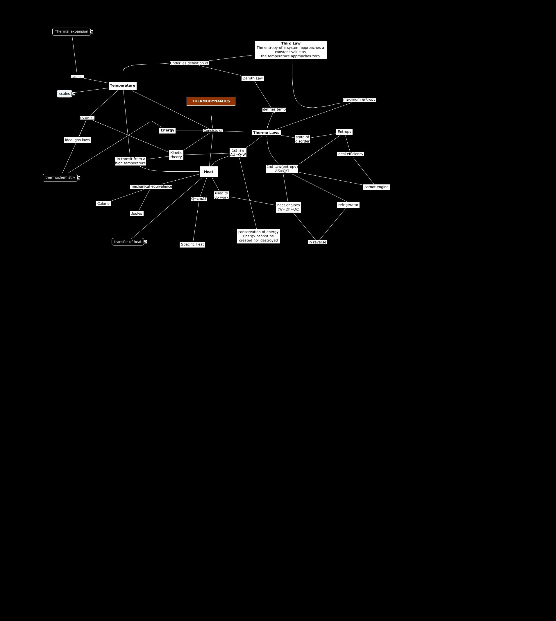This Concept Map, created with IHMC CmapTools, has information related to: ThermalConceptMap, Zeroth Law Underlies definition of Third Law The entropy of a system approaches a constant value as the temperature approaches zero., Entropy 2nd Law(entropy) ∆S=Q/T refrigerator, Energy thermochemistry, THERMODYNAMICS Consists of Kinetic theory, Entropy ideal efficiency carnot engine, Thermo Laws 1st law ∆U=Q-W conservation of energy Energy cannot be created nor destroyed, Entropy 2nd Law(entropy) ∆S=Q/T heat engines (W=Qh+Qc), Heat used to do work heat engines (W=Qh+Qc), THERMODYNAMICS Consists of Temperature, Heat transfer of convection, Thermo Laws 1st law ∆U=Q-W Kinetic theory, Temperature scales kelvin, Temperature scales fahrenheit, Thermo Laws maximum entropy Third Law The entropy of a system approaches a constant value as the temperature approaches zero., THERMODYNAMICS Consists of Heat, Temperature scales celsius, Zeroth Law Underlies definition of Temperature, Temperature Pv=nRT Kinetic theory, Thermal expansion change in volume, heat engines (W=Qh+Qc) in reverse refrigerator