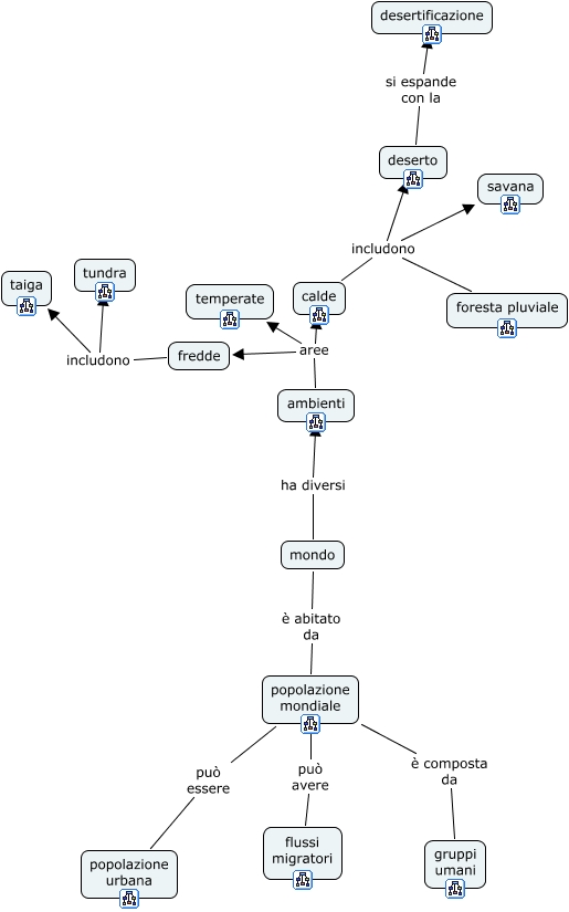 Questa Cmap, creata con IHMC CmapTools, contiene informazioni relative a: Mondo, ambienti aree fredde, fredde includono tundra, calde includono deserto, calde includono savana, fredde includono taiga, mondo ha diversi ambienti, mondo è abitato da popolazione mondiale, calde includono foresta pluviale, ambienti aree calde, deserto si espande con la desertificazione, ambienti aree temperate, popolazione mondiale può avere flussi migratori, popolazione mondiale è composta da gruppi umani, popolazione mondiale può essere popolazione urbana