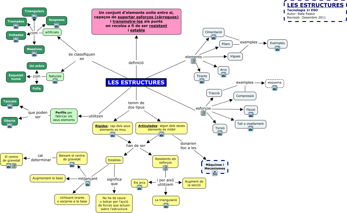 Aquest mapa conceptual conté informació relacionada amb: Estructures, LES ESTRUCTURES tenim de dos tipus Articulades: algun dels seues elements és mòbil, LES ESTRUCTURES esforços Flexió, Naturals com Esquelet humà, Perfils per fabricar els seus elements que poden ser Tancats, LES ESTRUCTURES esforços Torsió, artificials com Triangulars, Pilars exemples Exemples, Rígides: cap dels seus elements es mou han de ser Resistents als esforços, Cimentació exemples Exemples, LES ESTRUCTURES elements Pilars, Articulades: algun dels seues elements és mòbil han de ser Estables, LES ESTRUCTURES utilitzen Perfils per fabricar els seus elements, Articulades: algun dels seues elements és mòbil donarien lloc a les Màquines i Mecanismes, LES ESTRUCTURES elements Tirants, Estables mitjançant Utilitzant tirants o escaires a la base, LES ESTRUCTURES definició Un conjunt d'elements units entre si, capaços de suportar esforços (càrregues) i transmetre-les als punts on recolza a fi de ser resistent i estable, Rígides: cap dels seus elements es mou han de ser Estables, Estables mitjançant Baixant el centre de gravetat, artificials com Massives, Articulades: algun dels seues elements és mòbil han de ser Resistents als esforços