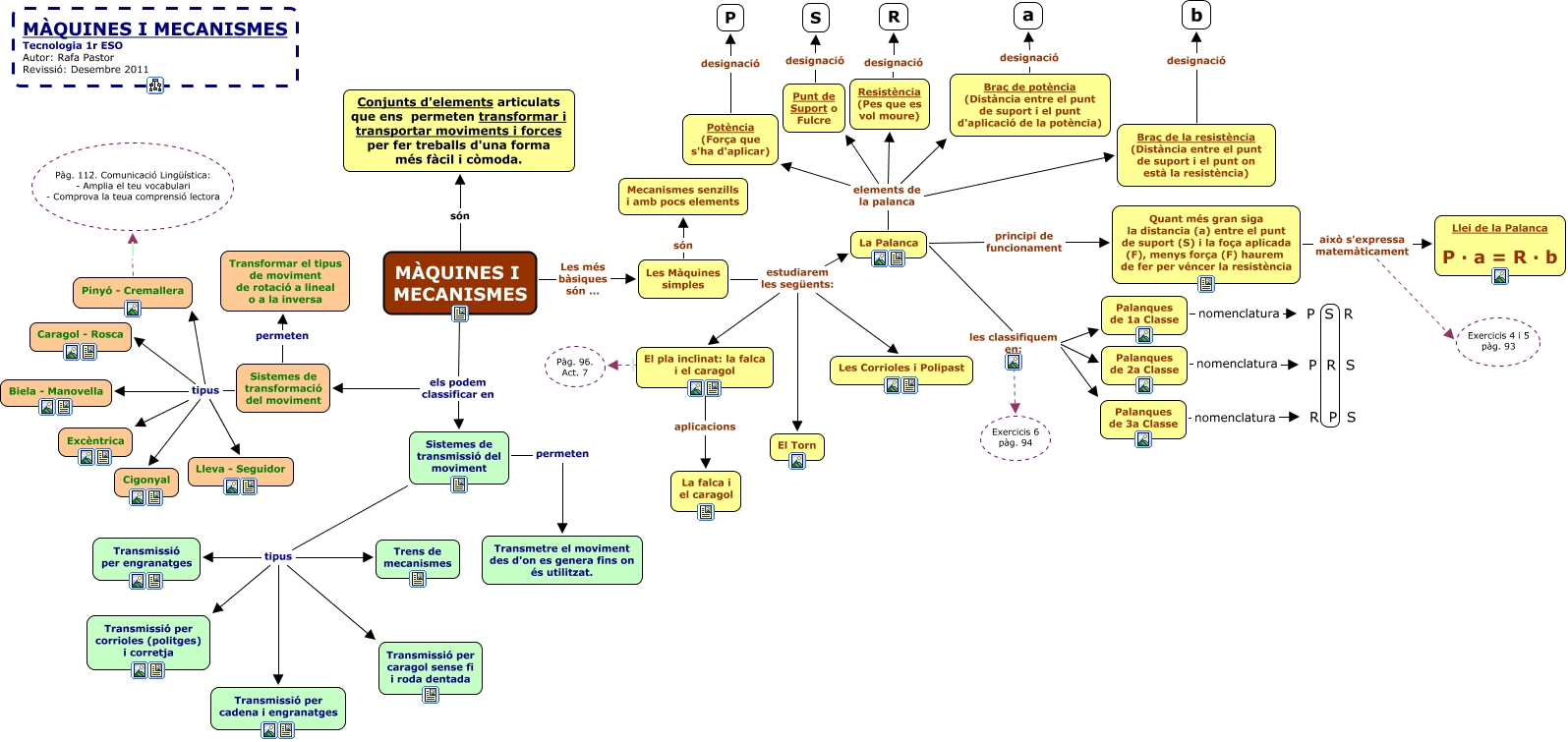 Aquest mapa conceptual conté informació relacionada amb: Màquines_Mecanismes, Pinyó - Cremallera Pàg. 112. Comunicació Lingüística: - Amplia el teu vocabulari - Comprova la teua comprensió lectora, El pla inclinat: la falca i el caragol aplicacions La falca i el caragol, Braç de potència (Distància entre el punt de suport i el punt d'aplicació de la potència) designació a, Sistemes de transformació del moviment permeten Transformar el tipus de moviment de rotació a lineal o a la inversa, La Palanca elements de la palanca Resistència (Pes que es vol moure), Sistemes de transformació del moviment tipus Biela - Manovella, MÀQUINES I MECANISMES els podem classificar en Sistemes de transmissió del moviment, La Palanca les classifiquem en: Palanques de 1a Classe, Potència (Força que s'ha d'aplicar) designació P, Braç de la resistència (Distància entre el punt de suport i el punt on està la resistència) designació b, Sistemes de transmissió del moviment permeten Transmetre el moviment des d'on es genera fins on és utilitzat., Sistemes de transformació del moviment tipus Pinyó - Cremallera, La Palanca elements de la palanca Braç de potència (Distància entre el punt de suport i el punt d'aplicació de la potència), Sistemes de transmissió del moviment tipus Trens de mecanismes, Palanques de 1a Classe nomenclatura P S R, Les Màquines simples estudiarem les següents: Les Corrioles i Polipast, Sistemes de transmissió del moviment tipus Transmissió per engranatges, Palanques de 2a Classe nomenclatura P R S, MÀQUINES I MECANISMES són Conjunts d'elements articulats que ens permeten transformar i transportar moviments i forces per fer treballs d'una forma més fàcil i còmoda., Sistemes de transmissió del moviment tipus Transmissió per caragol sense fi i roda dentada