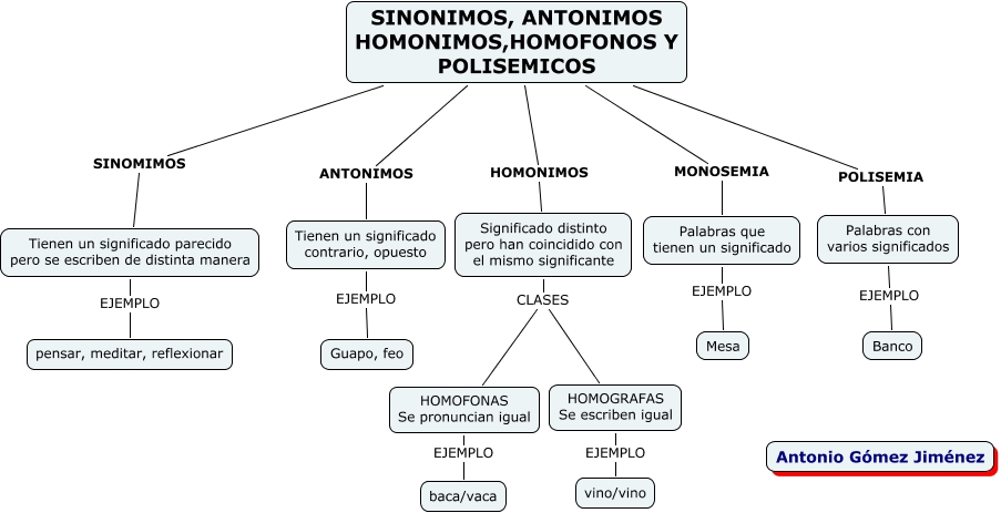 Este Cmap, tiene información relacionada con: PALABRAS SINONIMAS ANTONIMA, Tienen un significado parecido pero se escriben de distinta manera EJEMPLO pensar, meditar, reflexionar, SINONIMOS, ANTONIMOS HOMONIMOS,HOMOFONOS Y POLISEMICOS POLISEMIA Palabras con varios significados, HOMOGRAFAS Se escriben igual EJEMPLO vino/vino, SINONIMOS, ANTONIMOS HOMONIMOS,HOMOFONOS Y POLISEMICOS HOMONIMOS Significado distinto pero han coincidido con el mismo significante, Palabras que tienen un significado EJEMPLO Mesa, Significado distinto pero han coincidido con el mismo significante CLASES HOMOGRAFAS Se escriben igual, HOMOFONAS Se pronuncian igual EJEMPLO baca/vaca, SINONIMOS, ANTONIMOS HOMONIMOS,HOMOFONOS Y POLISEMICOS ANTONIMOS Tienen un significado contrario, opuesto, SINONIMOS, ANTONIMOS HOMONIMOS,HOMOFONOS Y POLISEMICOS SINOMIMOS Tienen un significado parecido pero se escriben de distinta manera, Significado distinto pero han coincidido con el mismo significante CLASES HOMOFONAS Se pronuncian igual, Tienen un significado contrario, opuesto EJEMPLO Guapo, feo, SINONIMOS, ANTONIMOS HOMONIMOS,HOMOFONOS Y POLISEMICOS MONOSEMIA Palabras que tienen un significado, Palabras con varios significados EJEMPLO Banco