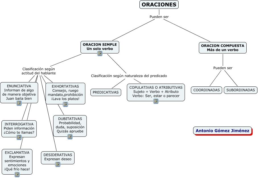 Este Cmap, tiene información relacionada con: 3.CLASIFICACION DE LAS ORACIONES, ORACION SIMPLE Un solo verbo Clasificación según actitud del hablante INTERROGATIVA Piden información ¿Cómo te llamas?, ORACIONES Pueden ser ORACION SIMPLE Un solo verbo, ORACION SIMPLE Un solo verbo Clasificación según naturaleza del predicado PREDICATIVAS, ORACION SIMPLE Un solo verbo Clasificación según actitud del hablante DUBITATIVAS Probabilidad, duda, suposición Quizás apruebe, ORACION SIMPLE Un solo verbo Clasificación según actitud del hablante EXCLAMATIVA Expresan sentimientos y emociones ¡Qué frío hace!, ORACIONES Pueden ser ORACION COMPUESTA Más de un verbo, ORACION SIMPLE Un solo verbo Clasificación según naturaleza del predicado COPULATIVAS O ATRIBUTIVAS Sujeto + Verbo + Atributo Verbo: Ser, estar o parecer, ORACION COMPUESTA Más de un verbo Pueden ser SUBORDINADAS, ORACION SIMPLE Un solo verbo Clasificación según actitud del hablante ENUNCIATIVA Informan de algo de manera objetiva Juan baila bien, ORACION COMPUESTA Más de un verbo Pueden ser COORDINADAS, ORACION SIMPLE Un solo verbo Clasificación según actitud del hablante DESIDERATIVAS Expresan deseo, ORACION SIMPLE Un solo verbo Clasificación según actitud del hablante EXHORTATIVAS Consejo, ruego mandato,prohibición ¡Lava los platos!