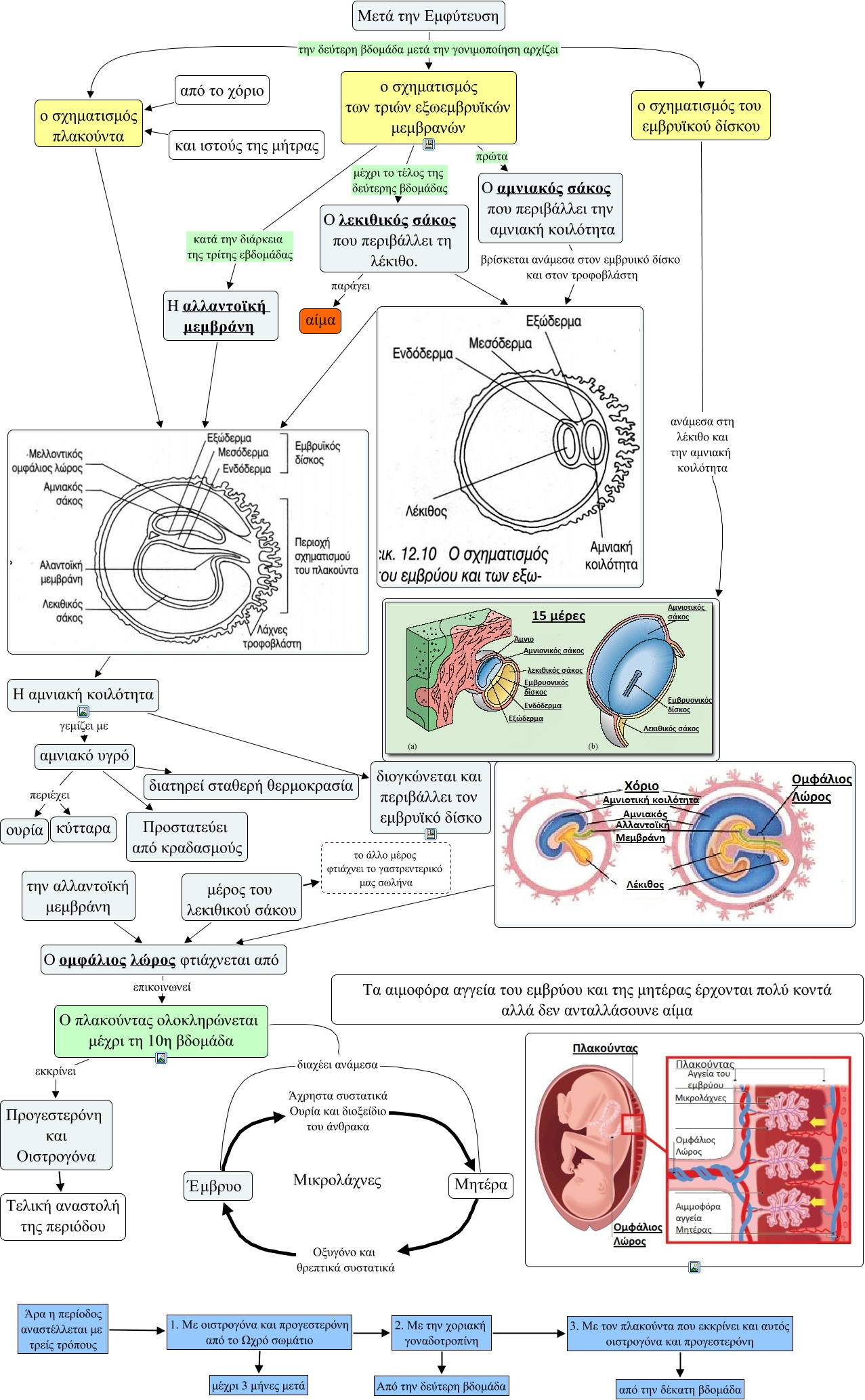 This Concept Map, created with IHMC CmapTools, has information related to: Placenta-Membranes-Embryonic disc, Η αλλαντοϊκή μεμβράνη, ο σχηματισμός των τριών εξωεμβρυϊκών μεμβρανών κατά την διάρκεια της τρίτης εβδομάδας Η αλλαντοϊκή μεμβράνη, 2. Με την χοριακή γοναδοτροπίνη Από την δεύτερη βδομάδα, Άρα η περίοδος αναστέλλεται με τρείς τρόπους 1. Με οιστρογόνα και προγεστερόνη από το Ωχρό σωμάτιο, Η αμνιακή κοιλότητα διογκώνεται και περιβάλλει τον εμβρυϊκό δίσκο, Μετά την Εμφύτευση την δεύτερη βδομάδα μετά την γονιμοποίηση αρχίζει ο σχηματισμός πλακούντα, από το χόριο ο σχηματισμός πλακούντα, Μετά την Εμφύτευση την δεύτερη βδομάδα μετά την γονιμοποίηση αρχίζει ο σχηματισμός των τριών εξωεμβρυϊκών μεμβρανών,, ο σχηματισμός του εμβρυϊκού δίσκου ανάμεσα στη λέκιθο και την αμνιακή κοιλότητα, 1. Με οιστρογόνα και προγεστερόνη από το Ωχρό σωμάτιο 2. Με την χοριακή γοναδοτροπίνη, αμνιακό υγρό Προστατεύει από κραδασμούς, μέρος του λεκιθικού σάκου το άλλο μέρος φτιάχνει το γαστρεντερικό μας σωλήνα, Ο λεκιθικός σάκος που περιβάλλει τη λέκιθο. παράγει αίμα, Ο πλακούντας ολοκληρώνεται μέχρι τη 10η βδομάδα εκκρίνει Προγεστερόνη και Οιστρογόνα, Ο αμνιακός σάκος που περιβάλλει την αμνιακή κοιλότητα βρίσκεται ανάμεσα στον εμβρυικό δίσκο και στον τροφοβλάστη, Μετά την Εμφύτευση την δεύτερη βδομάδα μετά την γονιμοποίηση αρχίζει ο σχηματισμός του εμβρυϊκού δίσκου, μέρος του λεκιθικού σάκου Ο ομφάλιος λώρος φτιάχνεται από, την αλλαντοϊκή μεμβράνη Ο ομφάλιος λώρος φτιάχνεται από, Ο ομφάλιος λώρος φτιάχνεται από επικοινωνεί Ο πλακούντας ολοκληρώνεται μέχρι τη 10η βδομάδα