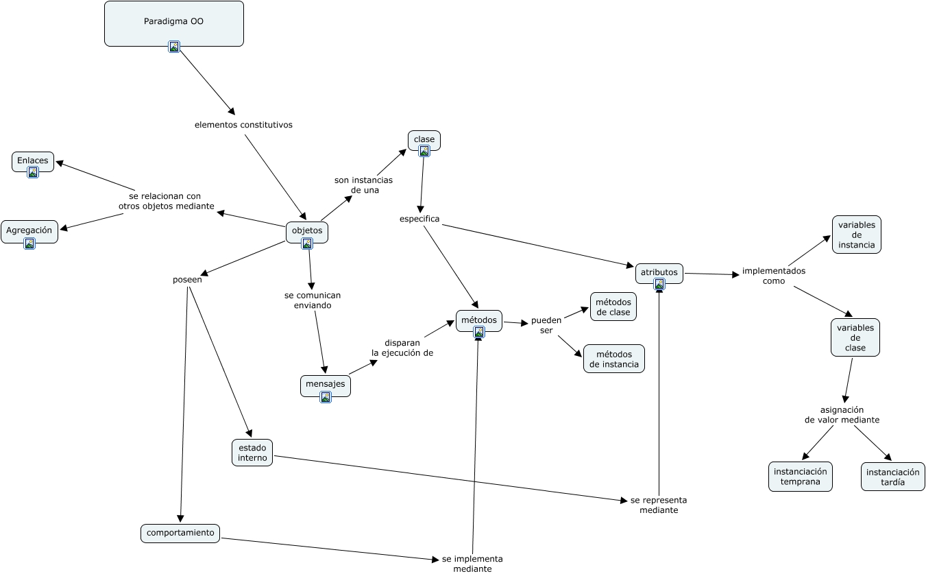 Este Cmap, tiene información relacionada con: Paradigma OO_Elementos estructurales, atributos implementados como variables de instancia, estado interno se representa mediante atributos, objetos poseen comportamiento, métodos pueden ser métodos de clase, comportamiento se implementa mediante métodos, clase especifica atributos, variables de clase asignación de valor mediante instanciación tardía, objetos se comunican enviando mensajes, objetos poseen estado interno, mensajes disparan la ejecución de métodos, variables de clase asignación de valor mediante instanciación temprana, objetos se relacionan con otros objetos mediante Agregación, Paradigma OO elementos constitutivos objetos, clase especifica métodos, atributos implementados como variables de clase, métodos pueden ser métodos de instancia, objetos son instancias de una clase, objetos se relacionan con otros objetos mediante Enlaces