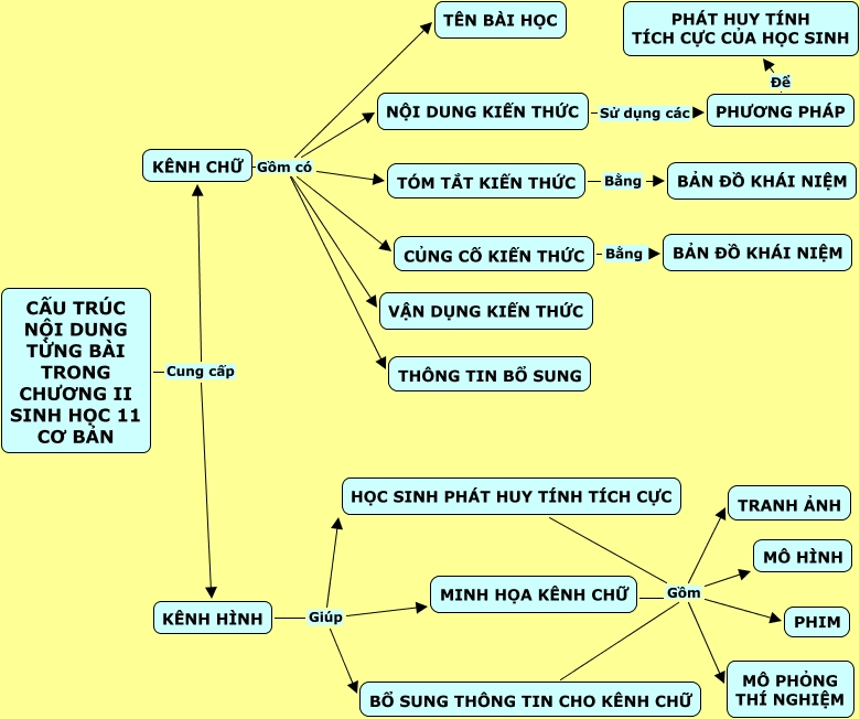 This Concept Map, created with IHMC CmapTools, has information related to: CẤU TRÚC ND TỪNG BÀI C II, KÊNH CHỮ Gồm có TÓM TẮT KIẾN THỨC, PHƯƠNG PHÁP Để PHÁT HUY TÍNH TÍCH CỰC CỦA HỌC SINH, MINH HỌA KÊNH CHỮ Gồm MÔ PHỎNG THÍ NGHIỆM, HỌC SINH PHÁT HUY TÍNH TÍCH CỰC Gồm MÔ HÌNH, BỔ SUNG THÔNG TIN CHO KÊNH CHỮ Gồm PHIM, CỦNG CỐ KIẾN THỨC Bằng BẢN ĐỒ KHÁI NIỆM, KÊNH CHỮ Gồm có NỘI DUNG KIẾN THỨC, HỌC SINH PHÁT HUY TÍNH TÍCH CỰC Gồm TRANH ẢNH, HỌC SINH PHÁT HUY TÍNH TÍCH CỰC Gồm MÔ PHỎNG THÍ NGHIỆM, KÊNH HÌNH Giúp BỔ SUNG THÔNG TIN CHO KÊNH CHỮ, BỔ SUNG THÔNG TIN CHO KÊNH CHỮ Gồm TRANH ẢNH, HỌC SINH PHÁT HUY TÍNH TÍCH CỰC Gồm PHIM, KÊNH CHỮ Gồm có THÔNG TIN BỔ SUNG, BỔ SUNG THÔNG TIN CHO KÊNH CHỮ Gồm MÔ HÌNH, BỔ SUNG THÔNG TIN CHO KÊNH CHỮ Gồm MÔ PHỎNG THÍ NGHIỆM, KÊNH HÌNH Giúp MINH HỌA KÊNH CHỮ, KÊNH CHỮ Gồm có CỦNG CỐ KIẾN THỨC, CẤU TRÚC NỘI DUNG TỪNG BÀI TRONG CHƯƠNG II SINH HỌC 11 CƠ BẢN Cung cấp KÊNH CHỮ, NỘI DUNG KIẾN THỨC Sử dụng các PHƯƠNG PHÁP, MINH HỌA KÊNH CHỮ Gồm PHIM