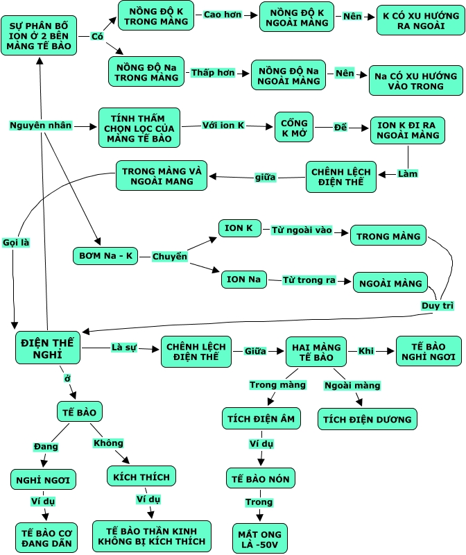 This Concept Map, created with IHMC CmapTools, has information related to: Điện thế nghỉ (sửa khuyết), TRONG MÀNG Duy trì ĐIỆN THẾ NGHỈ, BƠM Na - K Chuyển ION K, ĐIỆN THẾ NGHỈ Nguyên nhân TÍNH THẤM CHỌN LỌC CỦA MÀNG TẾ BÀO, ION K Từ ngoài vào TRONG MÀNG, HAI MÀNG TẾ BÀO Trong màng TÍCH ĐIỆN ÂM, HAI MÀNG TẾ BÀO Ngoài màng TÍCH ĐIỆN DƯƠNG, BƠM Na - K Chuyển ION Na, ION K ĐI RA NGOÀI MÀNG Làm CHÊNH LỆCH ĐIỆN THẾ, TRONG MÀNG VÀ NGOÀI MANG Gọi là ĐIỆN THẾ NGHỈ, ĐIỆN THẾ NGHỈ Nguyên nhân SỰ PHÂN BỐ ION Ở 2 BÊN MÀNG TẾ BÀO, TẾ BÀO Không KÍCH THÍCH, SỰ PHÂN BỐ ION Ở 2 BÊN MÀNG TẾ BÀO Có NỒNG ĐỘ K TRONG MÀNG, HAI MÀNG TẾ BÀO Khi TẾ BÀO NGHỈ NGƠI, CHÊNH LỆCH ĐIỆN THẾ giữa TRONG MÀNG VÀ NGOÀI MANG, ION Na Từ trong ra NGOÀI MÀNG, CHÊNH LỆCH ĐIỆN THẾ Giữa HAI MÀNG TẾ BÀO, SỰ PHÂN BỐ ION Ở 2 BÊN MÀNG TẾ BÀO Có NỒNG ĐỘ Na TRONG MÀNG, TÍCH ĐIỆN ÂM Ví dụ TẾ BÀO NÓN, KÍCH THÍCH Ví dụ TẾ BÀO THẦN KINH KHÔNG BỊ KÍCH THÍCH, ĐIỆN THẾ NGHỈ ở TẾ BÀO