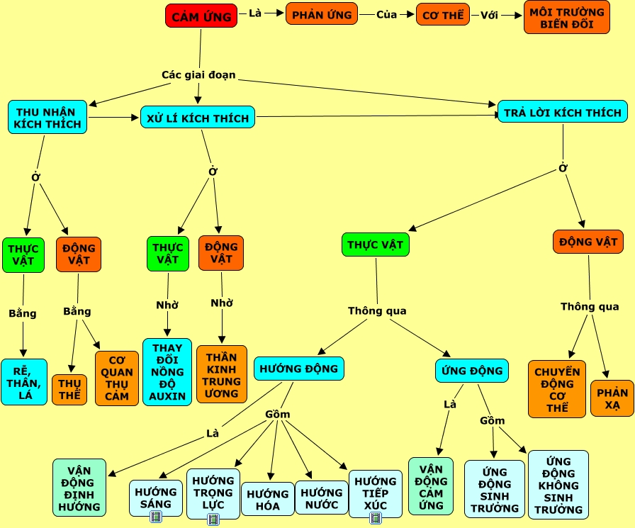 This Concept Map, created with IHMC CmapTools, has information related to: Cảm ứng chung ĐV và TV ở cơ thể hoàn chỉnh, đa truyền thông, đa chiều, ĐỘNG VẬT Thông qua PHẢN XẠ, THU NHẬN KÍCH THÍCH Ở ĐỘNG VẬT, THU NHẬN KÍCH THÍCH Ở THỰC VẬT, HƯỚNG ĐỘNG Gồm HƯỚNG HÓA, ĐỘNG VẬT Bằng CƠ QUAN THỤ CẢM, THỰC VẬT Thông qua HƯỚNG ĐỘNG, HƯỚNG ĐỘNG Gồm HƯỚNG NƯỚC, ĐỘNG VẬT Thông qua CHUYỂN ĐỘNG CƠ THỂ, XỬ LÍ KÍCH THÍCH ???? TRẢ LỜI KÍCH THÍCH, CẢM ỨNG Các giai đoạn THU NHẬN KÍCH THÍCH, HƯỚNG ĐỘNG Gồm HƯỚNG TRỌNG LỰC, THU NHẬN KÍCH THÍCH ???? XỬ LÍ KÍCH THÍCH, HƯỚNG ĐỘNG Gồm HƯỚNG SÁNG, HƯỚNG ĐỘNG Là VẬN ĐỘNG ĐỊNH HƯỚNG, ĐỘNG VẬT Bằng THỤ THỂ, THỰC VẬT Thông qua ỨNG ĐỘNG, XỬ LÍ KÍCH THÍCH Ở ĐỘNG VẬT, ỨNG ĐỘNG Gồm ỨNG ĐỘNG SINH TRƯỞNG, ỨNG ĐỘNG Là VẬN ĐỘNG CẢM ỨNG, THỰC VẬT Nhờ THAY ĐỔI NỒNG ĐỘ AUXIN