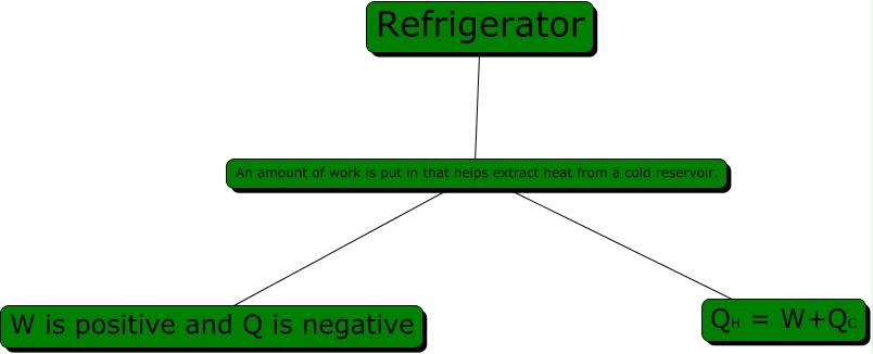 This Concept Map, created with IHMC CmapTools, has information related to: Refrigerator, Refrigerator ???? An amount of work is put in that helps extract heat from a cold reservoir., An amount of work is put in that helps extract heat from a cold reservoir. ???? QH = W+QC, An amount of work is put in that helps extract heat from a cold reservoir. ???? W is positive and Q is negative