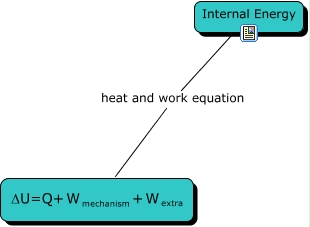 This Concept Map, created with IHMC CmapTools, has information related to: Internal Energy, Internal Energy heat and work equation <math xmlns="http://www.w3.org/1998/Math/MathML"> <mrow> <mtext> ΔU=Q+ </mtext> <mmultiscripts> <mtext> W </mtext> <mtext> mechanism </mtext> <none/> </mmultiscripts> <mtext> + </mtext> <mmultiscripts> <mtext> W </mtext> <mtext> extra </mtext> <none/> </mmultiscripts> </mrow> </math>