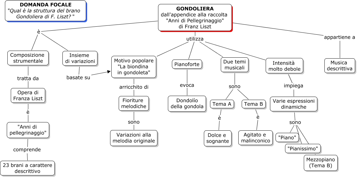 Questa Cmap, creata con IHMC CmapTools, contiene informazioni relative a: 5 Gondoliera (F. Liszt), Tema A è Dolce e sognante, Motivo popolare "La biondina in gondoleta" arricchito di Fioriture melodiche, Tema B è Agitato e malinconico, "Anni di pellegrinaggio" comprende 23 brani a carattere descrittivo, Opera di Franza Liszt è "Anni di pellegrinaggio", Intensità molto debole impiega Varie espressioni dinamiche, Insieme di variazioni basate su Motivo popolare "La biondina in gondoleta", GONDOLIERA dall'appendice alla raccolta "Anni di Pellegrinaggio" di Franz Liszt è Composizione strumentale, Due temi musicali sono Tema B, Pianoforte evoca Dondolìo della gondola, GONDOLIERA dall'appendice alla raccolta "Anni di Pellegrinaggio" di Franz Liszt è Insieme di variazioni, Fioriture melodiche sono Variazioni alla melodia originale, GONDOLIERA dall'appendice alla raccolta "Anni di Pellegrinaggio" di Franz Liszt utilizza Pianoforte, GONDOLIERA dall'appendice alla raccolta "Anni di Pellegrinaggio" di Franz Liszt utilizza Due temi musicali, GONDOLIERA dall'appendice alla raccolta "Anni di Pellegrinaggio" di Franz Liszt utilizza Intensità molto debole, Composizione strumentale tratta da Opera di Franza Liszt, Varie espressioni dinamiche sono Mezzopiano (Tema B), GONDOLIERA dall'appendice alla raccolta "Anni di Pellegrinaggio" di Franz Liszt appartiene a Musica descrittiva, Due temi musicali sono Tema A, GONDOLIERA dall'appendice alla raccolta "Anni di Pellegrinaggio" di Franz Liszt utilizza Motivo popolare "La biondina in gondoleta"