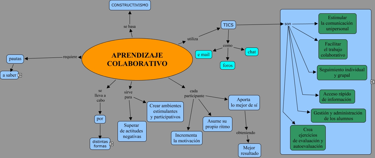 Este Cmap, tiene información relacionada con: EL APRENDIZAJE COLABORATIVO, TICS son Gestión y administración de los alumnos, TICS son Seguimiento individual y grupal, por son Grupo colaborativo, TICS como chat, Aporta lo mejor de sí obteniendo Mejor resultado, APRENDIZAJE COLABORATIVO se lleva a cabo por, TICS como e mail, APRENDIZAJE COLABORATIVO requiere pautas, por son Tutoreo de pares, APRENDIZAJE COLABORATIVO utiliza TICS, APRENDIZAJE COLABORATIVO cada participante Aporta lo mejor de sí, TICS son Estimular la comunicación unipersonal, pautas a saber Cuidado de relaciones socioafectivas, pautas a saber Elaboración de un plan de acción, pautas a saber Establecimiento de metas conjuntas, TICS son Crea ejercicios de evaluación y autoevaluación, pautas a saber Chequeo permanente del equipo, APRENDIZAJE COLABORATIVO sirve para Crear ambientes estimulantes y participativos, pautas a saber Discusiones sobre el producto final, TICS son Acceso rápido de información