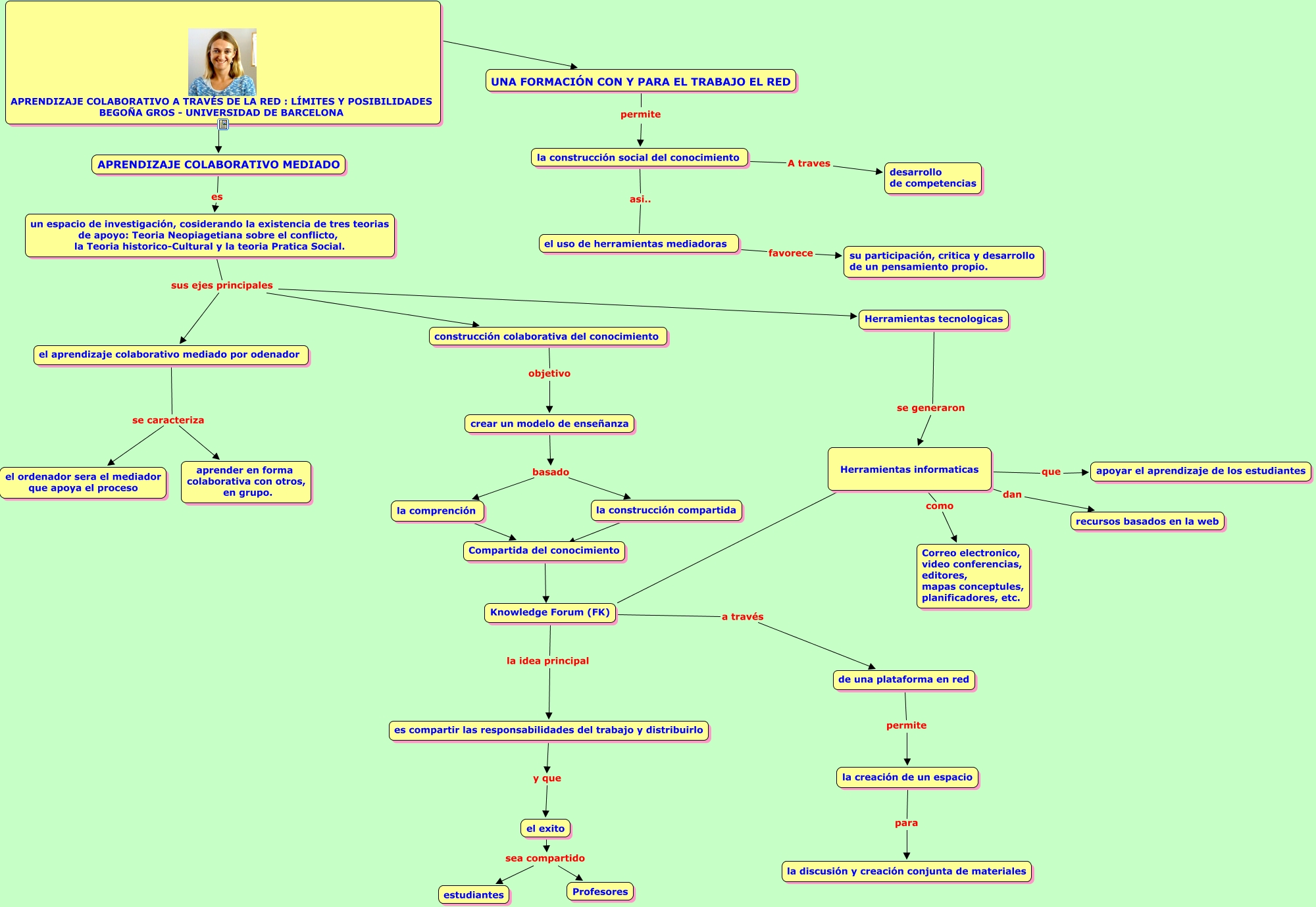 Este Cmap, tiene información relacionada con: Aprendizaje colabortivo atraves de la red, un espacio de investigación, cosiderando la existencia de tres teorias de apoyo: Teoria Neopiagetiana sobre el conflicto, la Teoria historico-Cultural y la teoria Pratica Social. sus ejes principales Herramientas tecnologicas, crear un modelo de enseñanza basado la construcción compartida, Herramientas informaticas como Correo electronico, video conferencias, editores, mapas conceptules, planificadores, etc., APRENDIZAJE COLABORATIVO A TRAVÉS DE LA RED : LÍMITES Y POSIBILIDADES BEGOÑA GROS - UNIVERSIDAD DE BARCELONA ???? UNA FORMACIÓN CON Y PARA EL TRABAJO EL RED, un espacio de investigación, cosiderando la existencia de tres teorias de apoyo: Teoria Neopiagetiana sobre el conflicto, la Teoria historico-Cultural y la teoria Pratica Social. sus ejes principales construcción colaborativa del conocimiento, APRENDIZAJE COLABORATIVO A TRAVÉS DE LA RED : LÍMITES Y POSIBILIDADES BEGOÑA GROS - UNIVERSIDAD DE BARCELONA ???? APRENDIZAJE COLABORATIVO MEDIADO, Herramientas informaticas que apoyar el aprendizaje de los estudiantes, el exito sea compartido estudiantes, APRENDIZAJE COLABORATIVO MEDIADO es un espacio de investigación, cosiderando la existencia de tres teorias de apoyo: Teoria Neopiagetiana sobre el conflicto, la Teoria historico-Cultural y la teoria Pratica Social., de una plataforma en red permite la creación de un espacio, crear un modelo de enseñanza basado la comprención, Knowledge Forum (FK) la idea principal es compartir las responsabilidades del trabajo y distribuirlo, el uso de herramientas mediadoras favorece su participación, critica y desarrollo de un pensamiento propio., el exito sea compartido Profesores, UNA FORMACIÓN CON Y PARA EL TRABAJO EL RED permite la construcción social del conocimiento, Knowledge Forum (FK) a través de una plataforma en red, Herramientas informaticas ???? Knowledge Forum (FK), Herramientas tecnologicas se generaron Herramientas informaticas, la construcción social del conocimiento asi.. el uso de herramientas mediadoras, la construcción compartida ???? ????