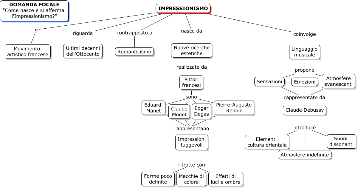 Questa Cmap, creata con IHMC CmapTools, contiene informazioni relative a: 2 Impressionismo, IMPRESSIONISMO è Movimento artistico francese, Sensazioni rappresentate da Claude Debussy, Claude Debussy introduce Atmosfere indefinite, Edgar Degas rappresentano Impressioni fuggevoli, Linguaggio musicale propone Emozioni, Atmosfere evanescenti rappresentate da Claude Debussy, IMPRESSIONISMO riguarda Ultimi decenni dell'Ottocento, Pittori francesi sono Pierre-Auguste Renoir, Pittori francesi sono Edgar Degas, IMPRESSIONISMO contrapposto a Romanticismo, Eduard Manet rappresentano Impressioni fuggevoli, Claude Monet rappresentano Impressioni fuggevoli, Linguaggio musicale propone Atmosfere evanescenti, Pittori francesi sono Claude Monet, Claude Debussy introduce Suoni dissonanti, IMPRESSIONISMO coinvolge Linguaggio musicale, IMPRESSIONISMO nasce da Nuove ricerche estetiche, Impressioni fuggevoli ritratte con Forme poco definite, Emozioni rappresentate da Claude Debussy, Linguaggio musicale propone Sensazioni