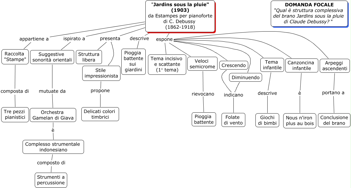 Questa Cmap, creata con IHMC CmapTools, contiene informazioni relative a: 3 Jardins sous la pluie (C. Debussy), "Jardins sous la pluie" (1903) da Estampes per pianoforte di C. Debussy (1862-1918) espone Canzoncina infantile, Diminuendo indicano Folate di vento, "Jardins sous la pluie" (1903) da Estampes per pianoforte di C. Debussy (1862-1918) espone Tema infantile, Orchestra Gamelan di Giava è Complesso strumentale indonesiano, "Jardins sous la pluie" (1903) da Estampes per pianoforte di C. Debussy (1862-1918) espone Diminuendo, Tema infantile descrive Giochi di bimbi, Veloci semicrome rievocano Pioggia battente, "Jardins sous la pluie" (1903) da Estampes per pianoforte di C. Debussy (1862-1918) ispirato a Suggestive sonorità orientali, "Jardins sous la pluie" (1903) da Estampes per pianoforte di C. Debussy (1862-1918) espone Arpeggi ascendenti, Canzoncina infantile è Nous n'iron plus au bois, Arpeggi ascendenti portano a Conclusione del brano, "Jardins sous la pluie" (1903) da Estampes per pianoforte di C. Debussy (1862-1918) espone Crescendo, "Jardins sous la pluie" (1903) da Estampes per pianoforte di C. Debussy (1862-1918) espone Tema incisivo e scattante (1° tema), "Jardins sous la pluie" (1903) da Estampes per pianoforte di C. Debussy (1862-1918) espone Veloci semicrome, "Jardins sous la pluie" (1903) da Estampes per pianoforte di C. Debussy (1862-1918) appartiene a Raccolta "Stampe", "Jardins sous la pluie" (1903) da Estampes per pianoforte di C. Debussy (1862-1918) presenta Stile impressionista, "Jardins sous la pluie" (1903) da Estampes per pianoforte di C. Debussy (1862-1918) descrive Pioggia battente sui giardini, "Jardins sous la pluie" (1903) da Estampes per pianoforte di C. Debussy (1862-1918) presenta Struttura libera, Raccolta "Stampe" composta di Tre pezzi pianistici, Crescendo indicano Folate di vento