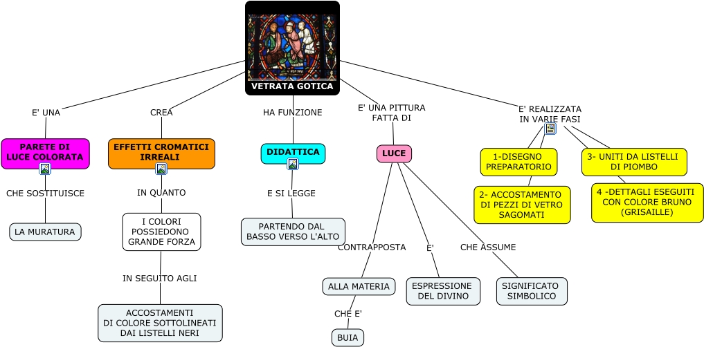 Questa Cmap, creata con IHMC CmapTools, contiene informazioni relative a: VETRATA, LUCE CONTRAPPOSTA ALLA MATERIA, LUCE CHE ASSUME SIGNIFICATO SIMBOLICO, VETRATA GOTICA CREA EFFETTI CROMATICI IRREALI, LUCE E' ESPRESSIONE DEL DIVINO, VETRATA GOTICA E' REALIZZATA IN VARIE FASI 3- UNITI DA LISTELLI DI PIOMBO, VETRATA GOTICA E' REALIZZATA IN VARIE FASI 2- ACCOSTAMENTO DI PEZZI DI VETRO SAGOMATI, VETRATA GOTICA E' REALIZZATA IN VARIE FASI 1-DISEGNO PREPARATORIO, EFFETTI CROMATICI IRREALI IN QUANTO I COLORI POSSIEDONO GRANDE FORZA, VETRATA GOTICA E' UNA PARETE DI LUCE COLORATA, ALLA MATERIA CHE E' BUIA, PARETE DI LUCE COLORATA CHE SOSTITUISCE LA MURATURA, VETRATA GOTICA HA FUNZIONE DIDATTICA, DIDATTICA E SI LEGGE PARTENDO DAL BASSO VERSO L'ALTO, VETRATA GOTICA E' REALIZZATA IN VARIE FASI 4 -DETTAGLI ESEGUITI CON COLORE BRUNO (GRISAILLE), VETRATA GOTICA E' UNA PITTURA FATTA DI LUCE, I COLORI POSSIEDONO GRANDE FORZA IN SEGUITO AGLI ACCOSTAMENTI DI COLORE SOTTOLINEATI DAI LISTELLI NERI