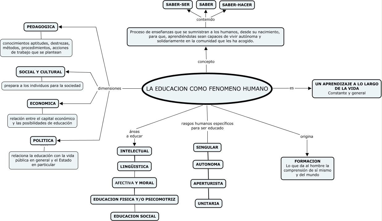 Este Cmap, tiene información relacionada con: TEMA 1, LA EDUCACION COMO FENOMENO HUMANO dimensiones SOCIAL Y CULTURAL, SOCIAL Y CULTURAL ???? prepara a los individuos para la sociedad, POLITICA ???? relaciona la educación con la vida pública en general y el Estado en particular, LINGÜISTICA ???? AFECTIVA Y MORAL, LA EDUCACION COMO FENOMENO HUMANO concepto Proceso de enseñanzas que se sumnistran a los humanos, desde su nacimiento, para que, aprendiéndolas sean capaces de vivir autónoma y solidariamente en la comunidad que les ha acogido., LA EDUCACION COMO FENOMENO HUMANO dimensiones POLITICA, Proceso de enseñanzas que se sumnistran a los humanos, desde su nacimiento, para que, aprendiéndolas sean capaces de vivir autónoma y solidariamente en la comunidad que les ha acogido. contenido SABER-SER, Proceso de enseñanzas que se sumnistran a los humanos, desde su nacimiento, para que, aprendiéndolas sean capaces de vivir autónoma y solidariamente en la comunidad que les ha acogido. contenido SABER, LA EDUCACION COMO FENOMENO HUMANO rasgos humanos específicos para ser educado SINGULAR, SINGULAR ???? AUTONOMA, LA EDUCACION COMO FENOMENO HUMANO es UN APRENDIZAJE A LO LARGO DE LA VIDA Constante y general, LA EDUCACION COMO FENOMENO HUMANO áreas a educar INTELECTUAL, LA EDUCACION COMO FENOMENO HUMANO origina FORMACION Lo que da al hombre la comprensión de sí mismo y del mundo, Proceso de enseñanzas que se sumnistran a los humanos, desde su nacimiento, para que, aprendiéndolas sean capaces de vivir autónoma y solidariamente en la comunidad que les ha acogido. contenido SABER-HACER, PEDAGOGICA ???? conocimientos aptitudes, destrezas, métodos, procedimientos, acciones de trabajo que se plantean, AUTONOMA ???? APERTURISTA, INTELECTUAL ???? LINGÜISTICA, EDUCACION FISICA Y/O PSICOMOTRIZ ???? EDUCACION SOCIAL, ECONOMICA ???? relación entre el capital económico y las posibilidades de educación, LA EDUCACION COMO FENOMENO HUMANO dimensiones PEDAGOGICA