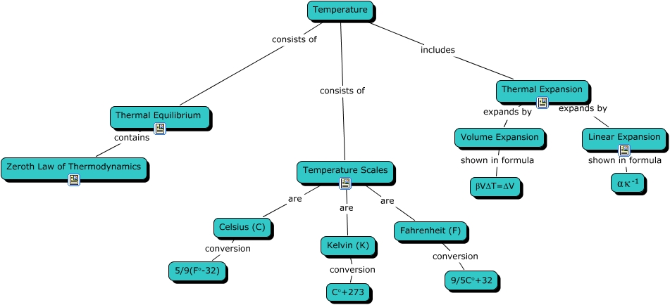 This Concept Map, created with IHMC CmapTools, has information related to: Temperature, Fahrenheit (F) conversion 9/5C°+32, Temperature Scales are Kelvin (K), Temperature includes Thermal Expansion, Temperature consists of Temperature Scales, Linear Expansion shown in formula <math xmlns="http://www.w3.org/1998/Math/MathML"> <mrow> <mtext> α </mtext> <mmultiscripts> <mtext> κ </mtext> <none/> <mtext> -1 </mtext> </mmultiscripts> </mrow> </math>, Thermal Expansion expands by Linear Expansion, Thermal Equilibrium contains Zeroth Law of Thermodynamics, Celsius (C) conversion 5/9(F°-32), Temperature Scales are Fahrenheit (F), Thermal Expansion expands by Volume Expansion, Kelvin (K) conversion C°+273, Temperature Scales are Celsius (C), Temperature consists of Thermal Equilibrium, Volume Expansion shown in formula βVΔT=ΔV