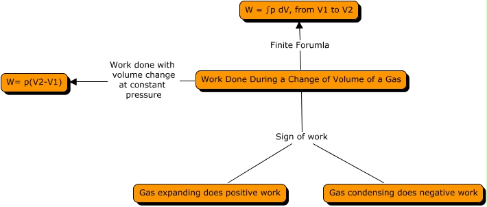 This Concept Map, created with IHMC CmapTools, has information related to: Work Done During a Change of Volume of a Gas, Work Done During a Change of Volume of a Gas Sign of work Gas expanding does positive work, Work Done During a Change of Volume of a Gas Sign of work Gas condensing does negative work, Work Done During a Change of Volume of a Gas Finite Forumla W = ∫p dV, from V1 to V2, Work Done During a Change of Volume of a Gas Work done with volume change at constant pressure W= p(V2-V1)