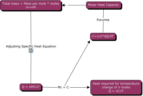 This Concept Map, created with IHMC CmapTools, has information related to: Molar Heat Capacity, Molar Heat Capacity Total mass = Mass per mole * moles m=nM, Q = nMCΔT Mc = C C=1/n*dQ/dT, Total mass = Mass per mole * moles m=nM Adjusting Specific Heat Equation Q = nMCΔT, Molar Heat Capacity Forumla C=1/n*dQ/dT, Q = nMCΔT Mc = C Heat required for temperature change of n moles Q = nCΔT