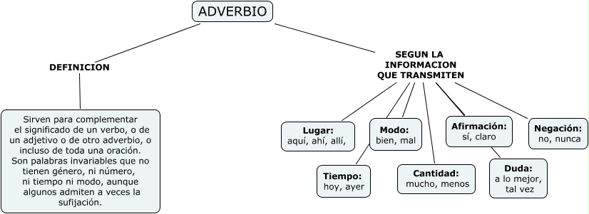 Este Cmap, tiene información relacionada con: ADVERBIO, ADVERBIO SEGUN LA INFORMACION QUE TRANSMITEN Lugar: aquí, ahí, allí,, ADVERBIO SEGUN LA INFORMACION QUE TRANSMITEN Afirmación: sí, claro, ADVERBIO DEFINICION Sirven para complementar el significado de un verbo, o de un adjetivo o de otro adverbio, o incluso de toda una oración. Son palabras invariables que no tienen género, ni número, ni tiempo ni modo, aunque algunos admiten a veces la sufijación., ADVERBIO SEGUN LA INFORMACION QUE TRANSMITEN Duda: a lo mejor, tal vez, ADVERBIO SEGUN LA INFORMACION QUE TRANSMITEN Cantidad: mucho, menos, ADVERBIO SEGUN LA INFORMACION QUE TRANSMITEN Modo: bien, mal, ADVERBIO SEGUN LA INFORMACION QUE TRANSMITEN Tiempo: hoy, ayer, ADVERBIO SEGUN LA INFORMACION QUE TRANSMITEN Negación: no, nunca