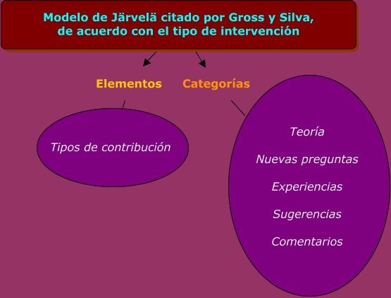 Este Cmap, tiene información relacionada con: Modelo de Järvelä, Modelo de Järvelä citado por Gross y Silva, de acuerdo con el tipo de intervención Categorías Teoría Nuevas preguntas Experiencias Sugerencias Comentarios, Modelo de Järvelä citado por Gross y Silva, de acuerdo con el tipo de intervención Elementos Tipos de contribución