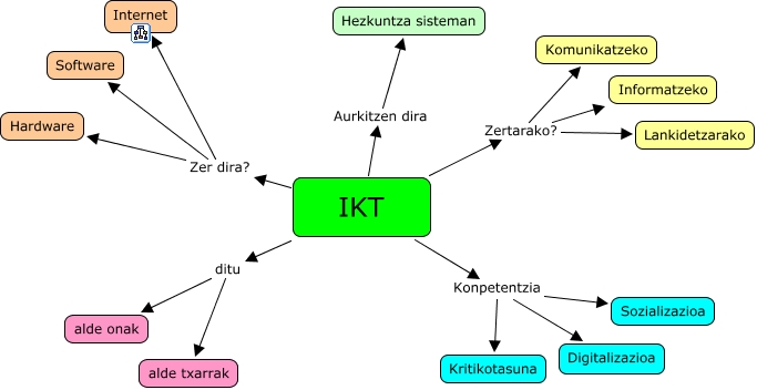 Este Cmap, tiene información relacionada con: Orokorra, IKT ditu alde onak, IKT Zertarako? Informatzeko, IKT Konpetentzia Digitalizazioa, IKT Zer dira? Hardware, IKT Zer dira? Software, IKT Zertarako? Lankidetzarako, IKT Zer dira? Internet, IKT Aurkitzen dira Hezkuntza sisteman, IKT Zertarako? Komunikatzeko, IKT Konpetentzia Kritikotasuna, IKT ditu alde txarrak, IKT Konpetentzia Sozializazioa