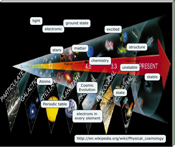 This Concept Map, created with IHMC CmapTools, has information related to: Cosmic Evolution, Cosmic Evolution have Atoms, excited which call ground state, structure is excited, electrons in every element it has two state, Cosmic Evolution have matter, Cosmic Evolution have stars, unstable happen because structure, state which is stable, Periodic table Have electrons in every element, state which is unstable, Cosmic Evolution online resource http://en.wikipedia.org/wiki/Physical_cosmology, ground state make electronic, ground state make light, Atoms which include Periodic table, Cosmic Evolution have chemistry