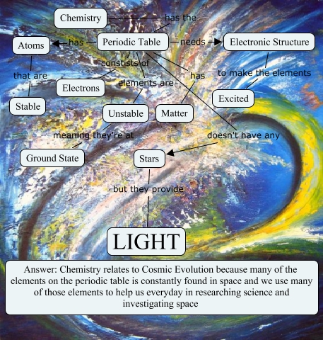 This Concept Map, created with IHMC CmapTools, has information related to: Focus Question, Periodic Table needs Electronic Structure, Unstable meaning they're at Ground State, Periodic Table constists of Electrons, Chemistry has the Periodic Table, Electronic Structure to make the elements Excited, Stars but they provide LIGHT, Periodic Table has Atoms, Periodic Table doesn't have any Stars, Periodic Table elements are Unstable, Periodic Table has Matter, Atoms that are Stable