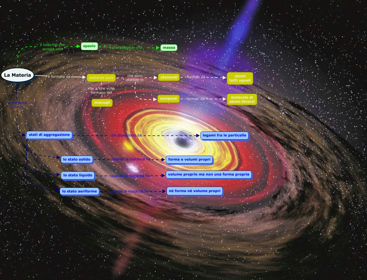 Questa Cmap, creata con IHMC CmapTools, contiene informazioni relative a: la materia.cmap, sostanze pure che a loro volta formano dei miscugli, stati di aggregazione lo stato liquido, stati di aggregazione lo stato solido, sostanze pure che sono distinte in composti, La Materia è formata da sostanze pure, composti formati da molecole di atomi diversi, stati di aggregazione che dipendono dai legami fra le particelle, spazio e che possiede una massa, La Materia si presenta in tre stati di aggregazione, lo stato aeriforme quando la sostanza ha nè forma nè volume propri, lo stato solido quando la sostanza ha forma e volumi propri, lo stato liquido quando la sostanza ha volume proprio ma non una forma propria, sostanze pure che sono distinte in elementi, elementi formati da atomi tutti uguali, La Materia è tutto ciò che occupa uno spazio, stati di aggregazione lo stato aeriforme