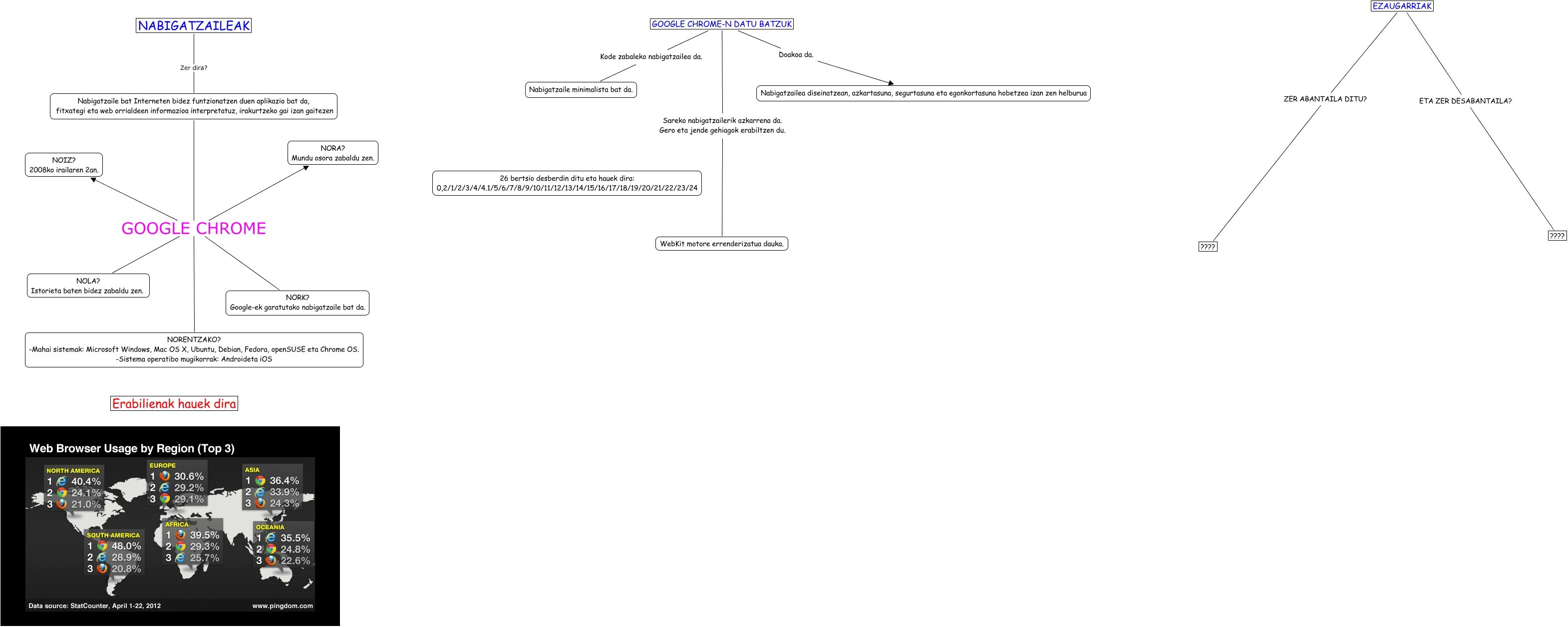 Este Cmap, tiene información relacionada con: GOOGLE CHROME, EZAUGARRIAK ETA ZER DESABANTAILA? ????, EZAUGARRIAK ZER ABANTAILA DITU? ????, Nabigatzaile bat Interneten bidez funtzionatzen duen aplikazio bat da, fitxategi eta web orrialdeen informazioa interpretatuz, irakurtzeko gai izan gaitezen GOOGLE CHROME NOIZ? 2008ko irailaren 2an., Nabigatzaile bat Interneten bidez funtzionatzen duen aplikazio bat da, fitxategi eta web orrialdeen informazioa interpretatuz, irakurtzeko gai izan gaitezen GOOGLE CHROME NORA? Mundu osora zabaldu zen., Nabigatzaile bat Interneten bidez funtzionatzen duen aplikazio bat da, fitxategi eta web orrialdeen informazioa interpretatuz, irakurtzeko gai izan gaitezen GOOGLE CHROME NORENTZAKO? -Mahai sistemak: Microsoft Windows, Mac OS X, Ubuntu, Debian, Fedora, openSUSE eta Chrome OS. -Sistema operatibo mugikorrak: Androideta iOS, GOOGLE CHROME-N DATU BATZUK Sareko nabigatzailerik azkarrena da. Gero eta jende gehiagok erabiltzen du. WebKit motore errenderizatua dauka., NABIGATZAILEAK Zer dira? Nabigatzaile bat Interneten bidez funtzionatzen duen aplikazio bat da, fitxategi eta web orrialdeen informazioa interpretatuz, irakurtzeko gai izan gaitezen, Nabigatzaile bat Interneten bidez funtzionatzen duen aplikazio bat da, fitxategi eta web orrialdeen informazioa interpretatuz, irakurtzeko gai izan gaitezen GOOGLE CHROME NORK? Google-ek garatutako nabigatzaile bat da., Nabigatzaile bat Interneten bidez funtzionatzen duen aplikazio bat da, fitxategi eta web orrialdeen informazioa interpretatuz, irakurtzeko gai izan gaitezen GOOGLE CHROME NOLA? Istorieta baten bidez zabaldu zen., GOOGLE CHROME-N DATU BATZUK Doakoa da. Nabigatzailea diseinatzean, azkartasuna, segurtasuna eta egonkortasuna hobetzea izan zen helburua, GOOGLE CHROME-N DATU BATZUK Kode zabaleko nabigatzailea da. Nabigatzaile minimalista bat da.