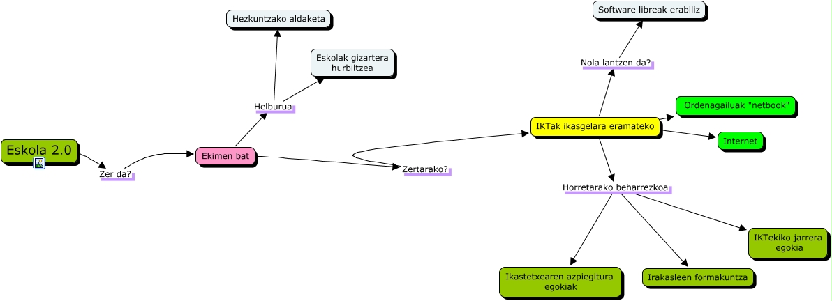 Este Cmap, tiene información relacionada con: Eskola 2.0, Ekimen bat Zertarako? IKTak ikasgelara eramateko, IKTak ikasgelara eramateko Nola lantzen da? Software libreak erabiliz, Ekimen bat Helburua Eskolak gizartera hurbiltzea, Ekimen bat Helburua Hezkuntzako aldaketa, Eskola 2.0 Zer da? Ekimen bat, IKTak ikasgelara eramateko Horretarako beharrezkoa Ikastetxearen azpiegitura egokiak, IKTak ikasgelara eramateko ???? Ordenagailuak "netbook", IKTak ikasgelara eramateko Horretarako beharrezkoa IKTekiko jarrera egokia, IKTak ikasgelara eramateko ???? Internet, IKTak ikasgelara eramateko Horretarako beharrezkoa Irakasleen formakuntza