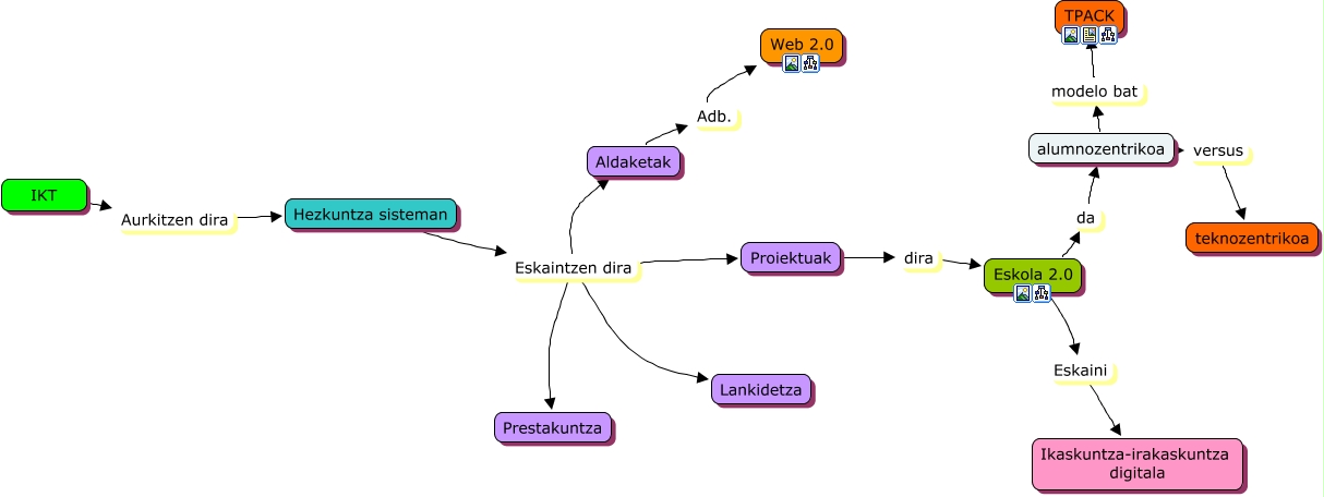 Este Cmap, tiene información relacionada con: Hezkuntza sistema, Aldaketak Adb. Web 2.0, Hezkuntza sisteman Eskaintzen dira Lankidetza, Hezkuntza sisteman Eskaintzen dira Prestakuntza, Proiektuak dira Eskola 2.0, alumnozentrikoa modelo bat TPACK, Hezkuntza sisteman Eskaintzen dira Aldaketak, Eskola 2.0 da alumnozentrikoa, Hezkuntza sisteman Eskaintzen dira Proiektuak, alumnozentrikoa versus teknozentrikoa, IKT Aurkitzen dira Hezkuntza sisteman, Eskola 2.0 Eskaini Ikaskuntza-irakaskuntza digitala