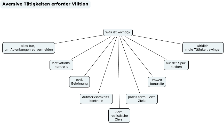 Dieses mit IHMC CmapTools erstellte CMap hat Informationen bezüglich: Aversive Tätigkeiten erforder Viltion, Was ist wichtig? Aufmerksamkeits- kontrolle, Was ist wichtig? auf der Spur bleiben, Was ist wichtig? klare, realistische Ziele, Was ist wichtig? Motivations- kontrolle, Was ist wichtig? Umwelt- kontrolle, Was ist wichtig? wirklich in die Tätigkeit zwingen, Was ist wichtig? präzis formulierte Ziele, Was ist wichtig? evtl. Belohnung, Was ist wichtig? alles tun, um Ablenkungen zu vermeiden