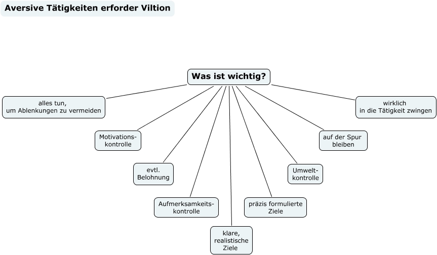 Dieses mit IHMC CmapTools erstellte CMap hat Informationen bezüglich: Was ist wichtig, Was ist wichtig? alles tun, um Ablenkungen zu vermeiden, Was ist wichtig? Umwelt- kontrolle, Was ist wichtig? Motivations- kontrolle, Was ist wichtig? evtl. Belohnung, Was ist wichtig? klare, realistische Ziele, Was ist wichtig? präzis formulierte Ziele, Was ist wichtig? wirklich in die Tätigkeit zwingen, Was ist wichtig? Aufmerksamkeits- kontrolle, Was ist wichtig? auf der Spur bleiben