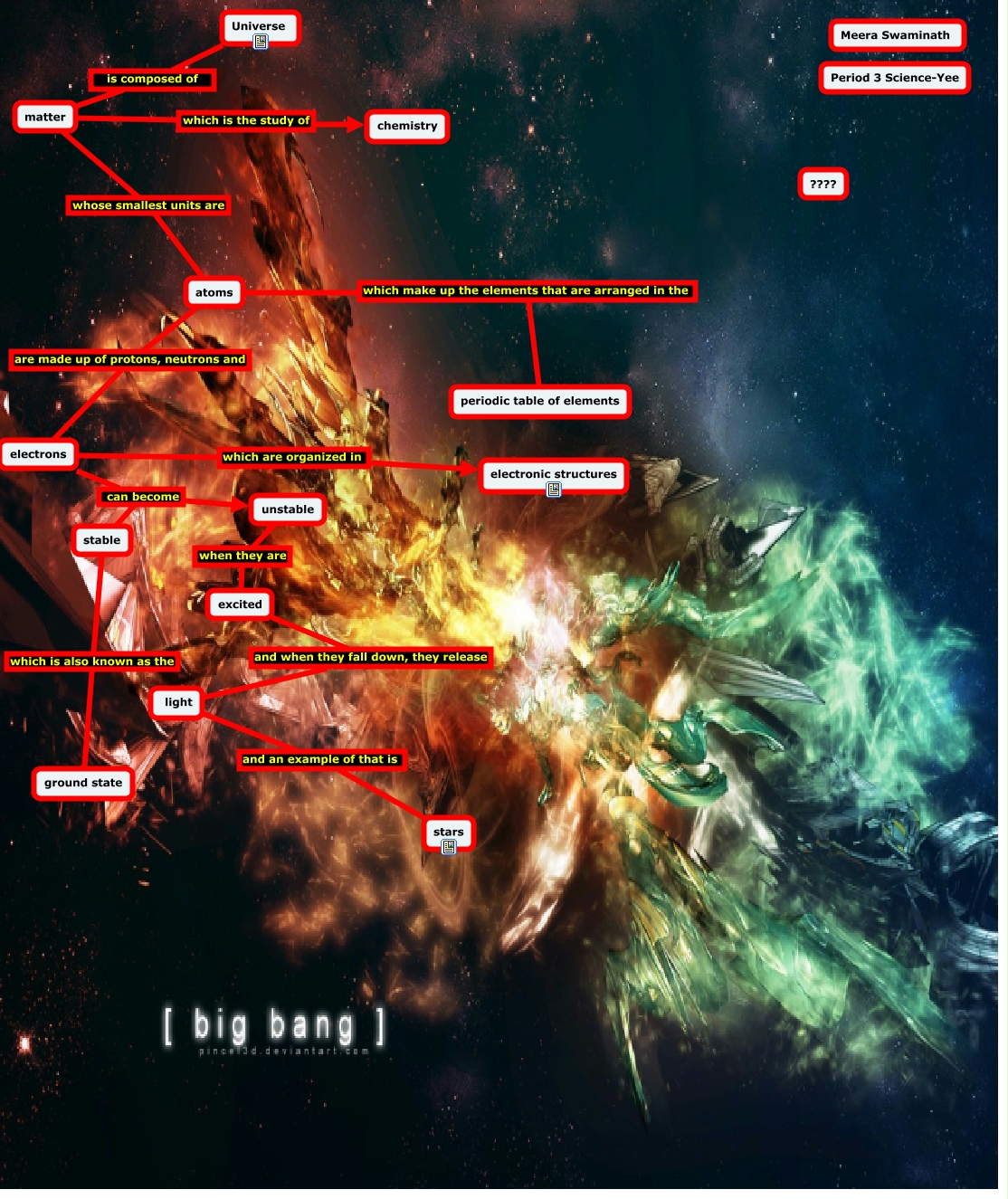This Concept Map, created with IHMC CmapTools, has information related to: Space, Chemistry, and the Cosmic Evolution, electrons can become stable, light and an example of that is stars, atoms are made up of protons, neutrons and electrons, matter whose smallest units are atoms, excited and when they fall down, they release light, Universe is composed of matter, atoms which make up the elements that are arranged in the periodic table of elements, matter which is the study of chemistry, stable which is also known as the ground state, unstable when they are excited, electrons can become unstable, electrons which are organized in electronic structures