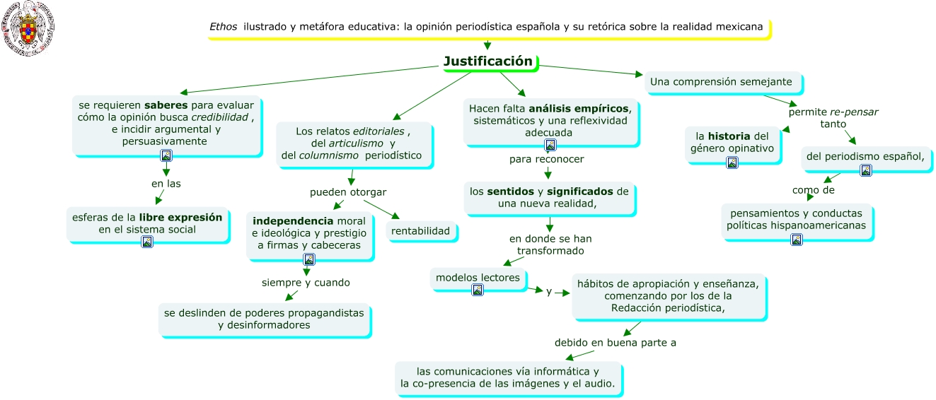 Este Cmap, tiene información relacionada con: PRESENTACION JUSTIFICACION, Hacen falta análisis empíricos, sistemáticos y una reflexividad adecuada para reconocer los sentidos y significados de una nueva realidad,, independencia moral e ideológica y prestigio a firmas y cabeceras siempre y cuando se deslinden de poderes propagandistas y desinformadores, Ethos ilustrado y metáfora educativa: la opinión periodística española y su retórica sobre la realidad mexicana Justificación se requieren saberes para evaluar cómo la opinión busca credibilidad, e incidir argumental y persuasivamente, Ethos ilustrado y metáfora educativa: la opinión periodística española y su retórica sobre la realidad mexicana Justificación Una comprensión semejante, Una comprensión semejante permite re-pensar tanto la historia del género opinativo, del periodismo español, como de pensamientos y conductas políticas hispanoamericanas, Una comprensión semejante permite re-pensar tanto del periodismo español,, los sentidos y significados de una nueva realidad, en donde se han transformado modelos lectores, hábitos de apropiación y enseñanza, comenzando por los de la Redacción periodística, debido en buena parte a las comunicaciones vía informática y la co-presencia de las imágenes y el audio., Los relatos editoriales, del articulismo y del columnismo periodístico pueden otorgar independencia moral e ideológica y prestigio a firmas y cabeceras, Ethos ilustrado y metáfora educativa: la opinión periodística española y su retórica sobre la realidad mexicana Justificación Los relatos editoriales, del articulismo y del columnismo periodístico, modelos lectores y hábitos de apropiación y enseñanza, comenzando por los de la Redacción periodística,, se requieren saberes para evaluar cómo la opinión busca credibilidad, e incidir argumental y persuasivamente en las esferas de la libre expresión en el sistema social, Ethos ilustrado y metáfora educativa: la opinión periodística española y su retórica sobre la realidad mexicana Justificación Hacen falta análisis empíricos, sistemáticos y una reflexividad adecuada, Los relatos editoriales, del articulismo y del columnismo periodístico pueden otorgar rentabilidad