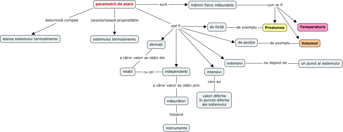 This Concept Map, created with IHMC CmapTools, has information related to: Parametri de stare, parametrii de stare pot fi independenți, parametrii de stare sunt mărimi fizice măsurabile, parametrii de stare pot fi de forță, măsurători folosind instrumente, parametrii de stare determină complet starea sistemului termodinamic, mărimi fizice măsurabile cum ar fi Temperatura, de poziție de exemplu Volumul, independenți a căror valori se obțin prin măsurători, derivați a căror valori se obțin din relații, mărimi fizice măsurabile cum ar fi Presiunea, parametrii de stare pot fi extensivi, de forță de exemplu Presiunea, extensivi nu depind de un punct al sistemului, parametrii de stare pot fi intensivi, parametrii de stare pot fi de poziție, parametrii de stare pot fi derivați, intensivi care au valori diferite în puncte diferite ale sistemului, parametrii de stare caracterizează proprietățile sistemului termodinamic, mărimi fizice măsurabile cum ar fi Volumul, independenți cu cei relații