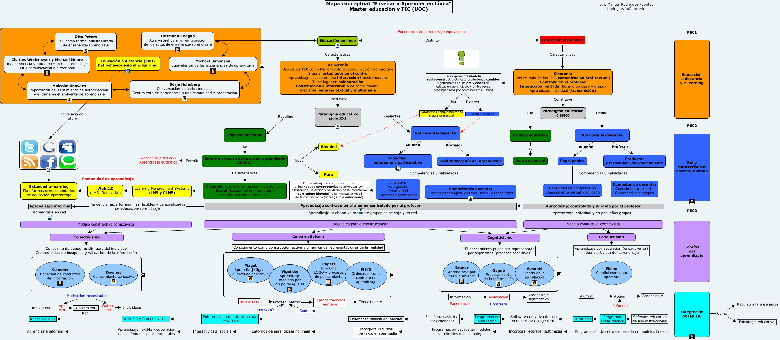 Este Cmap, tiene información relacionada con: Mapa conceptual educación en línea, Entornos de aprendizaje no lineal Interactividad (social), Alumno Acción Aprendizaje, Refuerzo Acción Aprendizaje, Paradigma educativo clásico Define Rol docente-discente, Software educativo de uso demostrativo-conjetural Programas de simulación, Programación de software basada en modelos lineales Incorpora recursos multimedia, Conectivismo Conocimiento puede residir fuera del individuo Competencias de búsqueda y validación de la información, Información Asimilación, Representaciones mentales Conocimiento, Paradigma educativo siglo XXI Redefine Espacio educativo, Modelo conductivo-cognitivista Conductismo, Integración de las TIC Como Estrategia educativa, Asimilación Aprendizaje significativo, Entorno virtual de educación-aprendizaje (EVEA) Permite Aprendizaje situado Aprendizaje auténtico, Interacción Proceso interno Representaciones mentales, Börje Holmberg Conversación didáctica mediada Sentimiento de pertenencia a una comunidad y cooperación Michael Simonson Equivalencia de las experiencias de aprendizaje, Web 2.0 (LMS+Red social) Extended e-learning Plataformas complementarias de educación-aprendizaje, Conductismo Aprendizaje por asociación (ensayo-error) Idea positivista del aprendizaje, Educación a distancia (EaD) Del behaviorismo al e-learning Tendencia de futuro, Rol docente-discente Profesor Facilitador/guía del aprendizaje