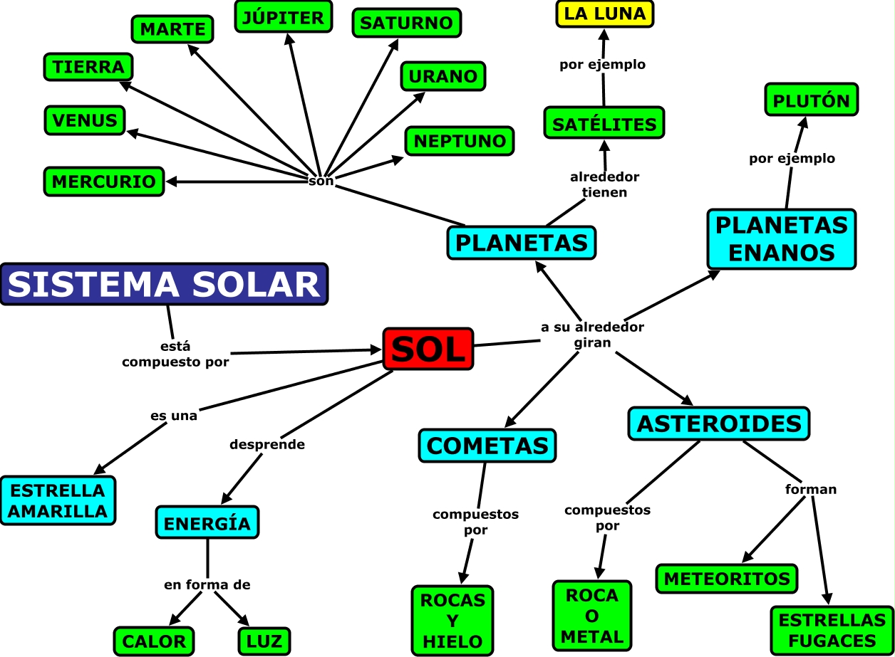 Este Cmap, tiene información relacionada con: sistema solar, SISTEMA SOLAR está compuesto por SOL, ASTEROIDES compuestos por ROCA O METAL, ENERGÍA en forma de LUZ, PLANETAS son MARTE, PLANETAS son MERCURIO, PLANETAS son TIERRA, COMETAS compuestos por ROCAS Y HIELO, SATÉLITES por ejemplo LA LUNA, PLANETAS son URANO, SOL a su alrededor giran PLANETAS ENANOS, SOL a su alrededor giran ASTEROIDES, SOL desprende ENERGÍA, PLANETAS alrededor tienen SATÉLITES, PLANETAS son SATURNO, SOL a su alrededor giran COMETAS, PLANETAS son NEPTUNO, PLANETAS ENANOS por ejemplo PLUTÓN, SOL es una ESTRELLA AMARILLA, ENERGÍA en forma de CALOR, PLANETAS son VENUS