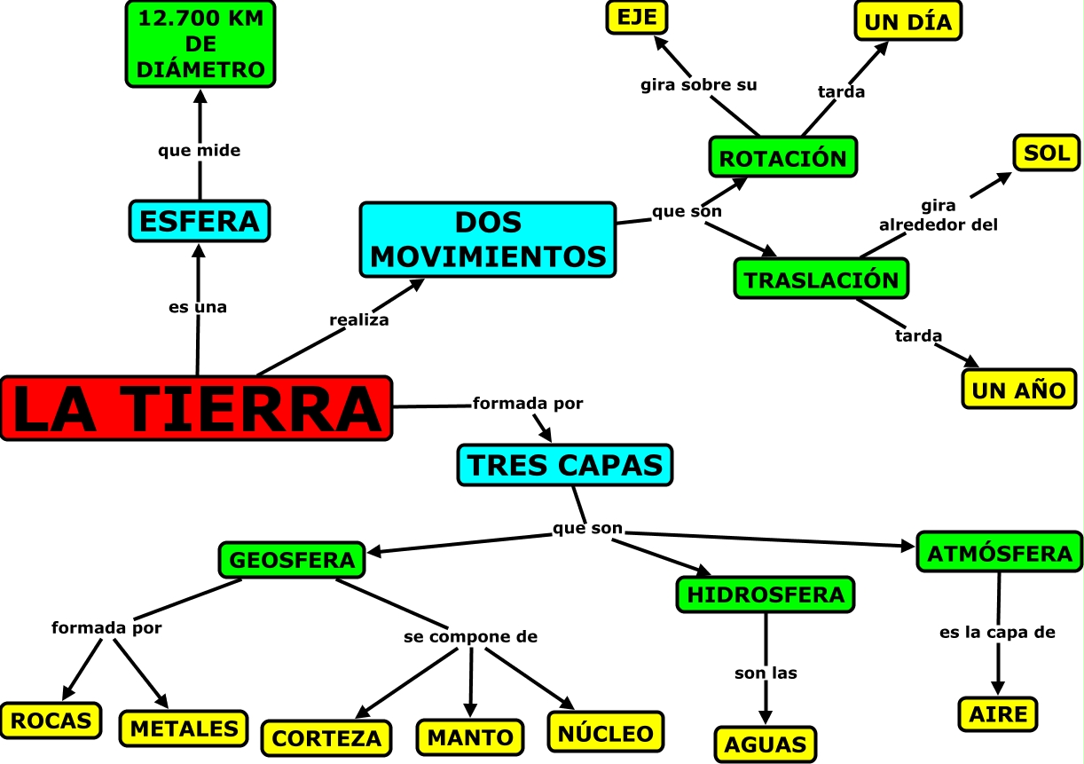 Este Cmap, tiene información relacionada con: la tierra, ATMÓSFERA es la capa de AIRE, ROTACIÓN gira sobre su EJE, GEOSFERA formada por METALES, TRES CAPAS que son ATMÓSFERA, GEOSFERA se compone de NÚCLEO, LA TIERRA realiza DOS MOVIMIENTOS, LA TIERRA formada por TRES CAPAS, LA TIERRA es una ESFERA, GEOSFERA formada por ROCAS, GEOSFERA se compone de CORTEZA, GEOSFERA se compone de MANTO, TRES CAPAS que son GEOSFERA, ROTACIÓN tarda UN DÍA, DOS MOVIMIENTOS que son ROTACIÓN, TRES CAPAS que son HIDROSFERA, DOS MOVIMIENTOS que son TRASLACIÓN, HIDROSFERA son las AGUAS, TRASLACIÓN tarda UN AÑO, ESFERA que mide 12.700 KM DE DIÁMETRO, TRASLACIÓN gira alrededor del SOL