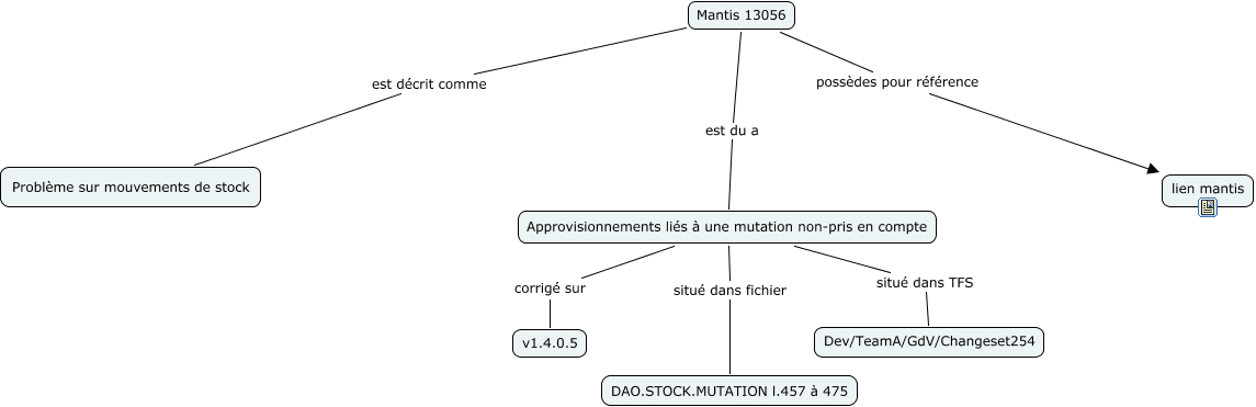 Cette carte de concepts créée avec IHMC CmapTools traite de: Résolution mantis 13056, Mantis 13056 possèdes pour référence lien mantis, Approvisionnements liés à une mutation non-pris en compte corrigé sur v1.4.0.5, Approvisionnements liés à une mutation non-pris en compte situé dans fichier DAO.STOCK.MUTATION l.457 à 475, Mantis 13056 est du a Approvisionnements liés à une mutation non-pris en compte, Approvisionnements liés à une mutation non-pris en compte situé dans TFS Dev/TeamA/GdV/Changeset254