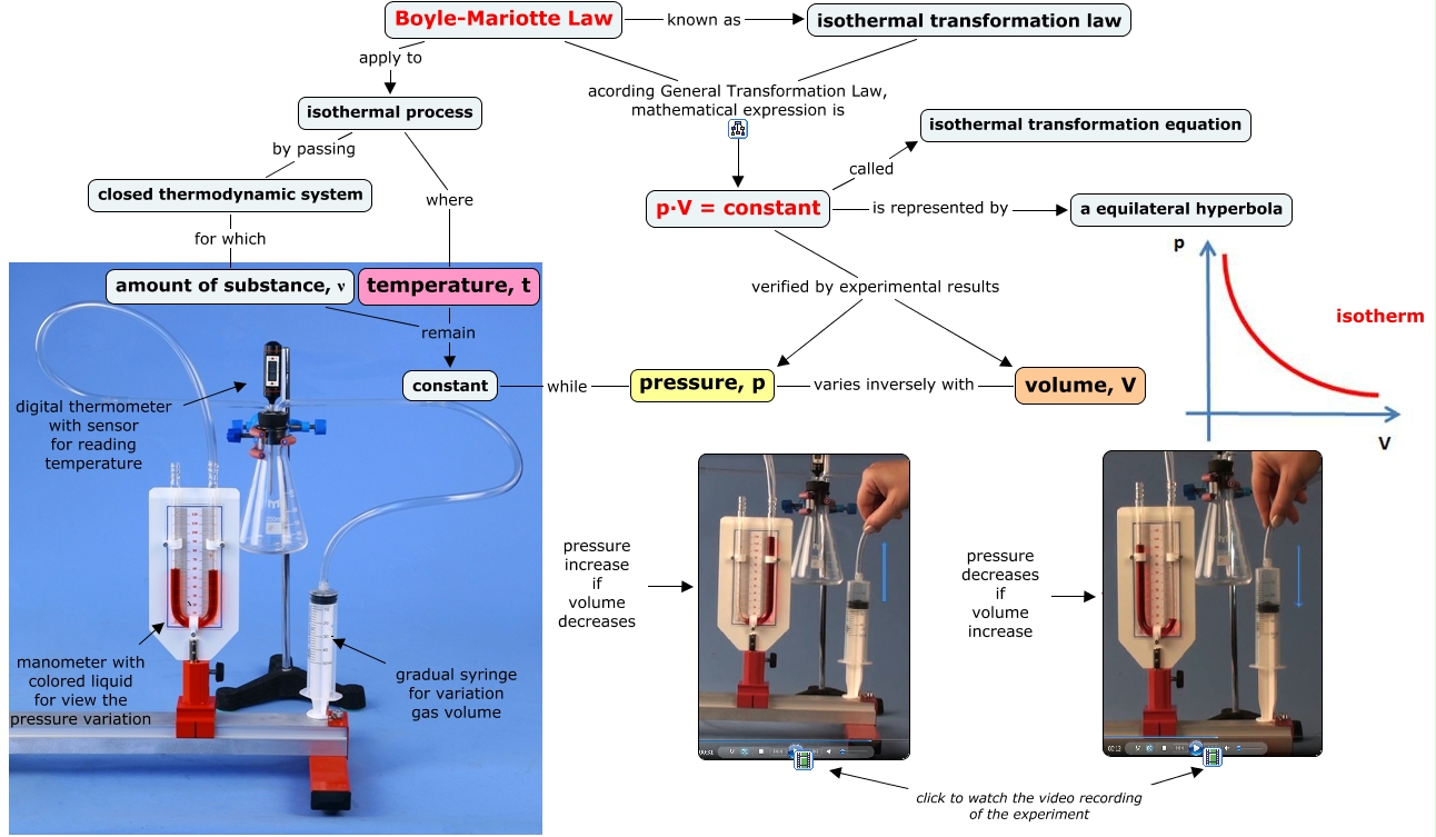 This Concept Map, created with IHMC CmapTools, has information related to: Cmap for Boyle-Mariotte Law, p·V = constant verified by experimental results pressure, p, manometer with colored liquid for view the pressure variation ???? ????, amount of substance, ν remain constant, isothermal transformation law acording General Transformation Law, mathematical expression is p·V = constant, pressure, p varies inversely with volume, V, constant while pressure, p, isothermal process where temperature, t, p·V = constant called isothermal transformation equation, Boyle-Mariotte Law apply to isothermal process, pressure increase if volume decreases ????, gradual syringe for variation gas volume ???? ????, Boyle-Mariotte Law acording General Transformation Law, mathematical expression is p·V = constant, isothermal process by passing closed thermodynamic system, digital thermometer with sensor for reading temperature ???? ????, click to watch the video recording of the experiment ???? ????, p·V = constant is represented by a equilateral hyperbola, p·V = constant verified by experimental results volume, V, pressure decreases if volume increase ????, temperature, t remain constant, Boyle-Mariotte Law known as isothermal transformation law