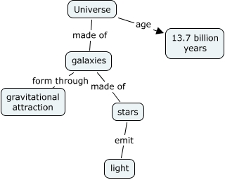 This Concept Map, created with IHMC CmapTools, has information related to: StudyUniverse, galaxies made of stars, galaxies form through gravitational attraction, Universe age 13.7 billion years, stars emit light, Universe made of galaxies