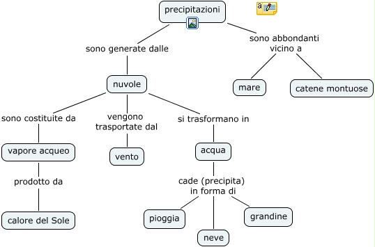 Questa Cmap, creata con IHMC CmapTools, contiene informazioni relative a: V1 C3 e) Le precipitazioni, vapore acqueo prodotto da calore del Sole, acqua cade (precipita) in forma di pioggia, precipitazioni sono abbondanti vicino a catene montuose, precipitazioni sono abbondanti vicino a mare, acqua cade (precipita) in forma di neve, nuvole vengono trasportate dal vento, precipitazioni sono generate dalle nuvole, acqua cade (precipita) in forma di grandine, nuvole si trasformano in acqua, nuvole sono costituite da vapore acqueo