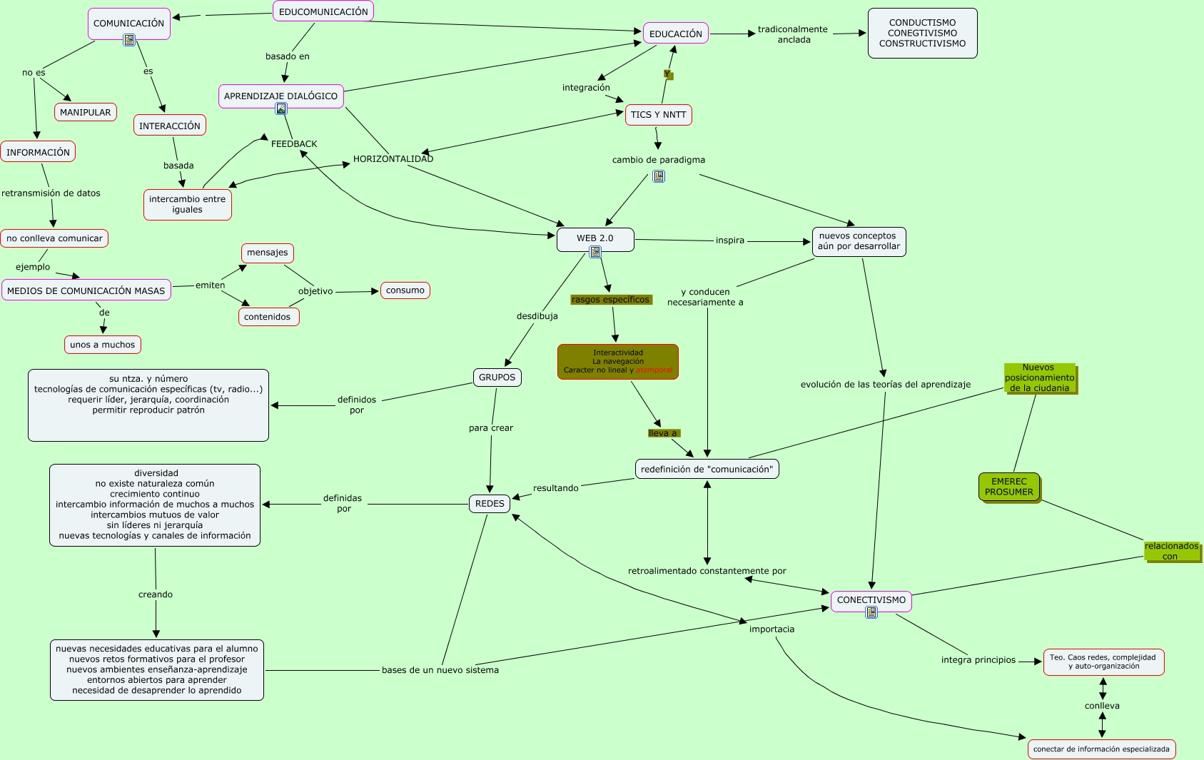 Este Cmap, tiene información relacionada con: Sonia, COMUNICACIÓN no es INFORMACIÓN, intercambio entre iguales HORIZONTALIDAD TICS Y NNTT, EDUCOMUNICACIÓN basado en APRENDIZAJE DIALÓGICO, GRUPOS definidos por su ntza. y número tecnologías de comunicación específicas (tv, radio...) requerir líder, jerarquía, coordinación permitir reproducir patrón, EMEREC PROSUMER relacionados con ????, EDUCOMUNICACIÓN COMUNICACIÓN, mensajes objetivo consumo, INFORMACIÓN retransmisión de datos no conlleva comunicar, contenidos objetivo consumo, EDUCACIÓN tradiconalmente anclada CONDUCTISMO CONEGTIVISMO CONSTRUCTIVISMO, INTERACCIÓN basada intercambio entre iguales, REDES bases de un nuevo sistema CONECTIVISMO, redefinición de "comunicación" Nuevos posicionamiento de la ciudania EMEREC PROSUMER, nuevos conceptos aún por desarrollar y conducen necesariamente a redefinición de "comunicación", COMUNICACIÓN no es MANIPULAR, WEB 2.0 desdibuja GRUPOS, TICS Y NNTT cambio de paradigma WEB 2.0, EDUCACIÓN integración TICS Y NNTT, nuevas necesidades educativas para el alumno nuevos retos formativos para el profesor nuevos ambientes enseñanza-aprendizaje entornos abiertos para aprender necesidad de desaprender lo aprendido bases de un nuevo sistema CONECTIVISMO, COMUNICACIÓN es INTERACCIÓN