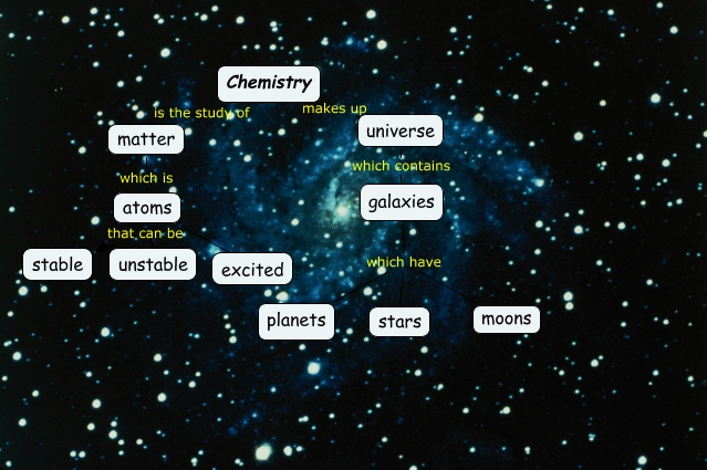 This Concept Map, created with IHMC CmapTools, has information related to: cosmic evolution, galaxies which have stars, atoms ???? unstable, atoms that can be stable, atoms ???? excited, matter which is atoms, galaxies which have planets, Chemistry is the study of matter, galaxies which have moons, universe which contains galaxies, Chemistry makes up universe
