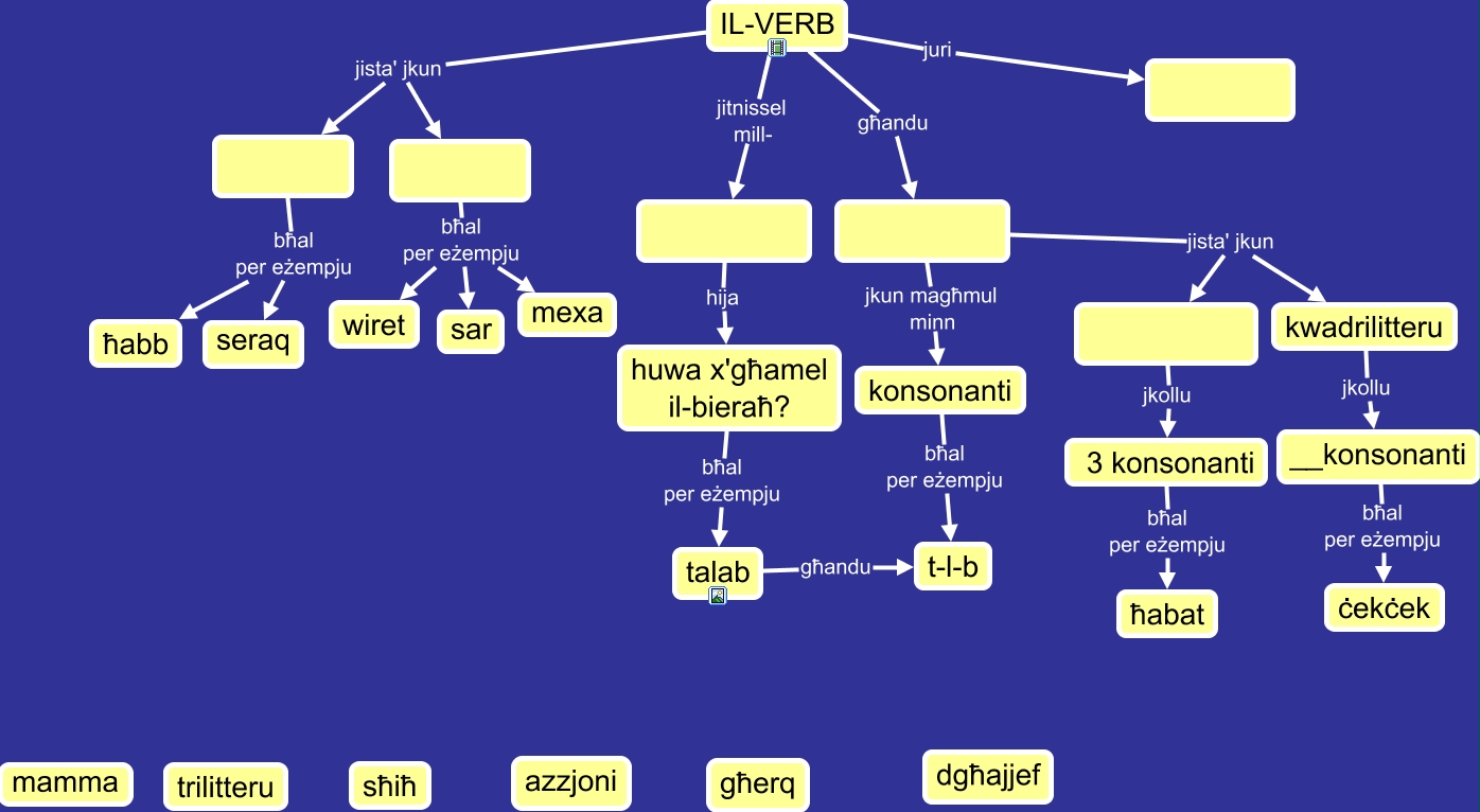 This Concept Map, created with IHMC CmapTools, has information related to: il-verb, IL-VERB juri, IL-VERB għandu, __konsonanti bħal per eżempju ċekċek, huwa x'għamel il-bieraħ? bħal per eżempju talab, bħal per eżempju seraq, bħal per eżempju sar, kwadrilitteru jkollu __konsonanti, hija huwa x'għamel il-bieraħ?, talab għandu t-l-b, bħal per eżempju ħabb, jista' jkun kwadrilitteru, IL-VERB jista' jkun, bħal per eżempju wiret, IL-VERB jista' jkun, jkollu 3 konsonanti, konsonanti bħal per eżempju t-l-b, IL-VERB jitnissel mill-, jista' jkun, jkun magħmul minn konsonanti, 3 konsonanti bħal per eżempju ħabat