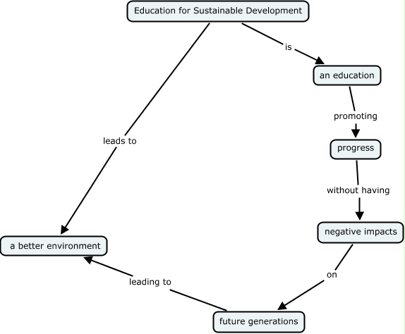 This Concept Map, created with IHMC CmapTools, has information related to: Lucianne EDS 1, Education for Sustainable Development leads to a better environment, negative impacts on future generations, an education promoting progress, progress without having negative impacts, Education for Sustainable Development is an education, future generations leading to a better environment