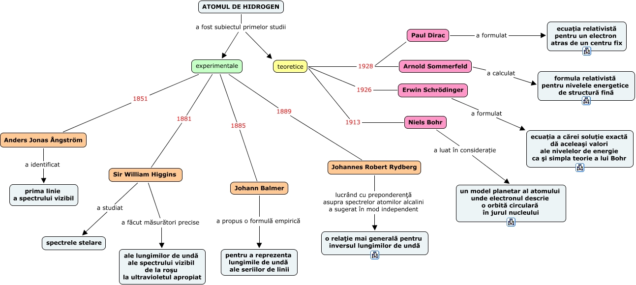 This Concept Map, created with IHMC CmapTools, has information related to: Primele studii ale atomului de hidrogen, Sir William Higgins a făcut măsurători precise ale lungimilor de undă ale spectrului vizibil de la roşu la ultravioletul apropiat, ATOMUL DE HIDROGEN a fost subiectul primelor studii teoretice, Erwin Schrödinger a formulat ecuația a cărei soluție exactă dă aceleaşi valori ale nivelelor de energie ca şi simpla teorie a lui Bohr, Johann Balmer a propus o formulă empirică pentru a reprezenta lungimile de undă ale seriilor de linii, teoretice 1913 Niels Bohr, experimentale 1851 Anders Jonas Ångström, Johannes Robert Rydberg lucrând cu preponderenţă asupra spectrelor atomilor alcalini a sugerat în mod independent o relaţie mai generală pentru inversul lungimilor de undă, Paul Dirac a formulat ecuația relativistă pentru un electron atras de un centru fix, teoretice 1928 Paul Dirac, Arnold Sommerfeld a calculat <math xmlns="http://www.w3.org/1998/Math/MathML"> <mrow> <mtext> formula relativistă